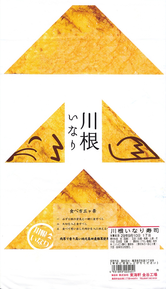 2017(平成29)年か、その前年の発売か。2018年時点でも「新発売」の扱いで販売している模様。持ち帰り寿司向けの薄く平たく小さな容器に、川根いなりの名と特徴でデザインした掛紙を巻く。中身は五目酢飯を油揚げに包んだ、直角二等辺三角形のおいなりさんが3個と、五目豆と生姜。