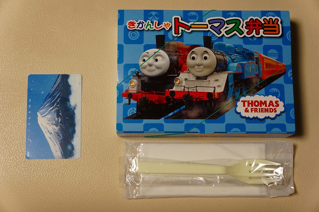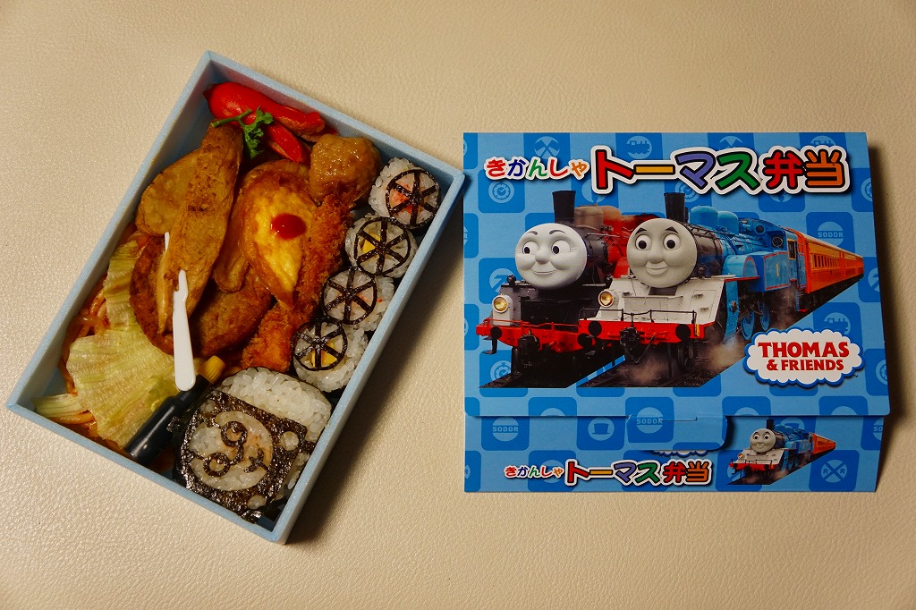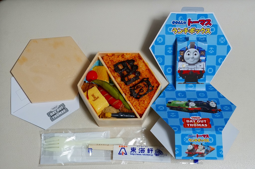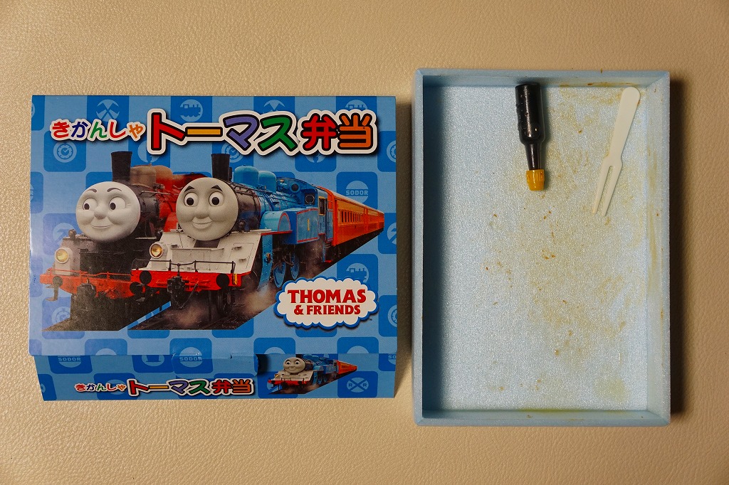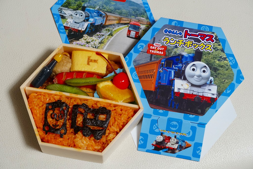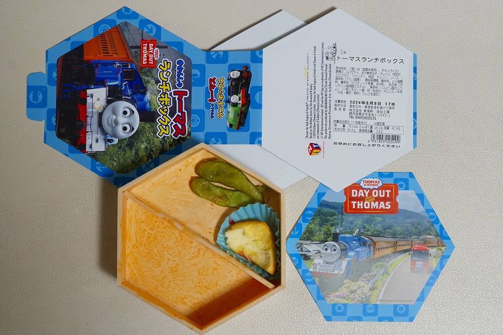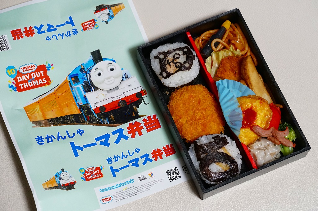 キャラクター柄でない水色の折箱に収めた中身は、ツナの太巻きと、カニカマと玉子焼の細巻き、ハンバーグ、エビフライ、スパゲティ、ウインナー、フライドポテト、オムレツ、肉団子など。子供向けというか、ジャンクフードというか、まるで冷凍商品の詰合せ。そんな中身が何であれ、キャラクター列車を彩る関連グッズで、トーマスに会いに来た子供たちの記憶に残ることだろう。駅に加えて列車内でも売りに来た。なお、きかんしゃトーマスの駅弁は先に新神戸駅で出ている。2020年の夏までに「きかんしゃトーマスランチボックス」と交代し終売。