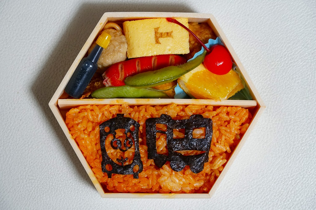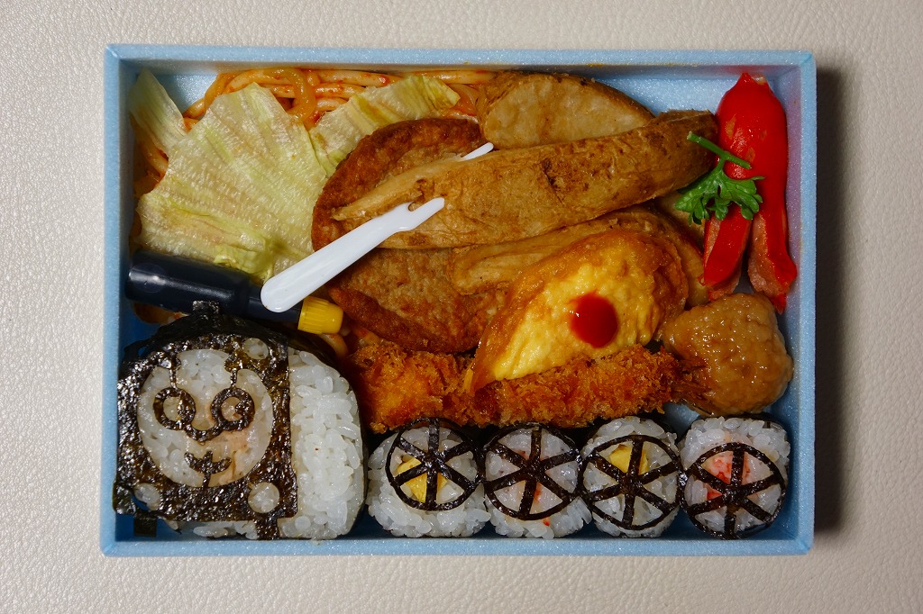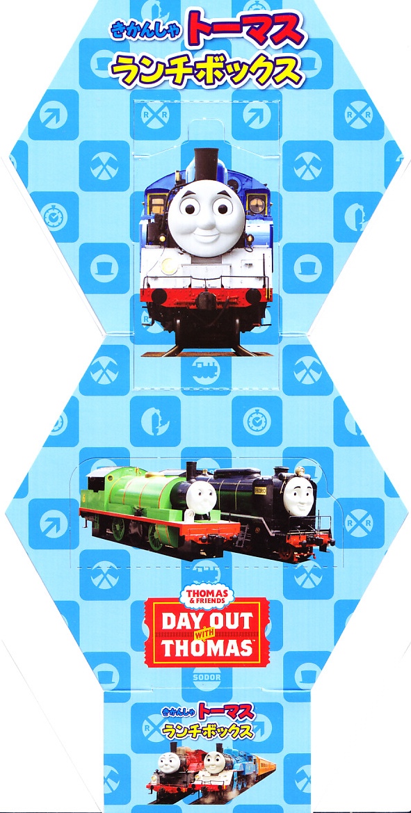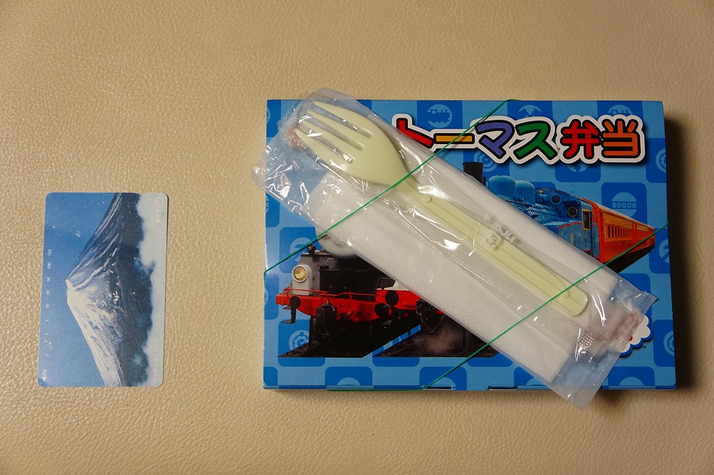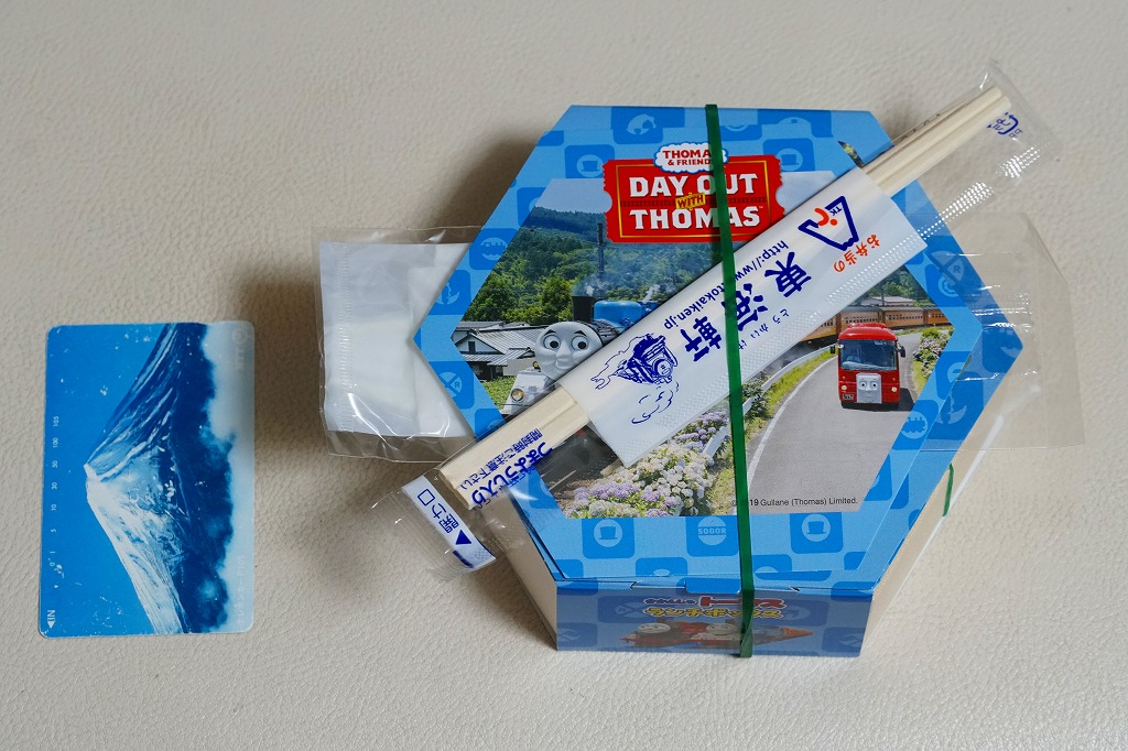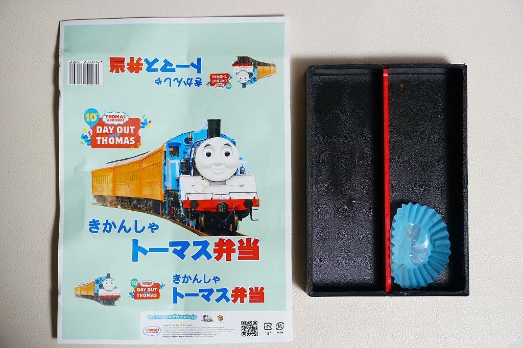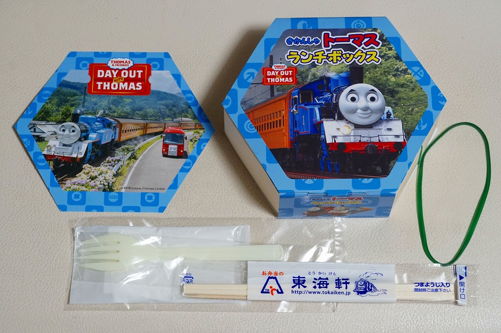 キャラクター柄でない水色の折箱に収めた中身は、ツナの太巻きと、カニカマと玉子焼の細巻き、ハンバーグ、エビフライ、スパゲティ、ウインナー、フライドポテト、オムレツ、肉団子など。子供向けというか、ジャンクフードというか、まるで冷凍商品の詰合せ。そんな中身が何であれ、キャラクター列車を彩る関連グッズで、トーマスに会いに来た子供たちの記憶に残ることだろう。駅に加えて列車内でも売りに来た。なお、きかんしゃトーマスの駅弁は先に新神戸駅で出ている。2020年の夏までに「きかんしゃトーマスランチボックス」と交代し終売。
