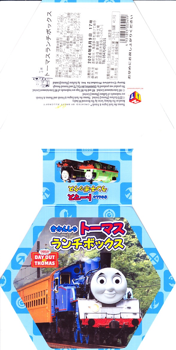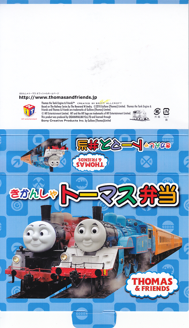 大井川鐵道のSL列車「きかんしゃトーマス号」の運行開始に合わせて、2014(平成27)年7月に麦茶付きで950円の予約専用弁当として発売、翌年6月に中身を買えて単体で一般販売を開始した模様。パッケージの絵柄はもちろん、イギリスの幼児向けテレビ番組「きかんしゃトーマス」のキャラクター。上面のトーマスとジェームスは、大井川鐵道の蒸気機関車を装飾した実物の写真である。