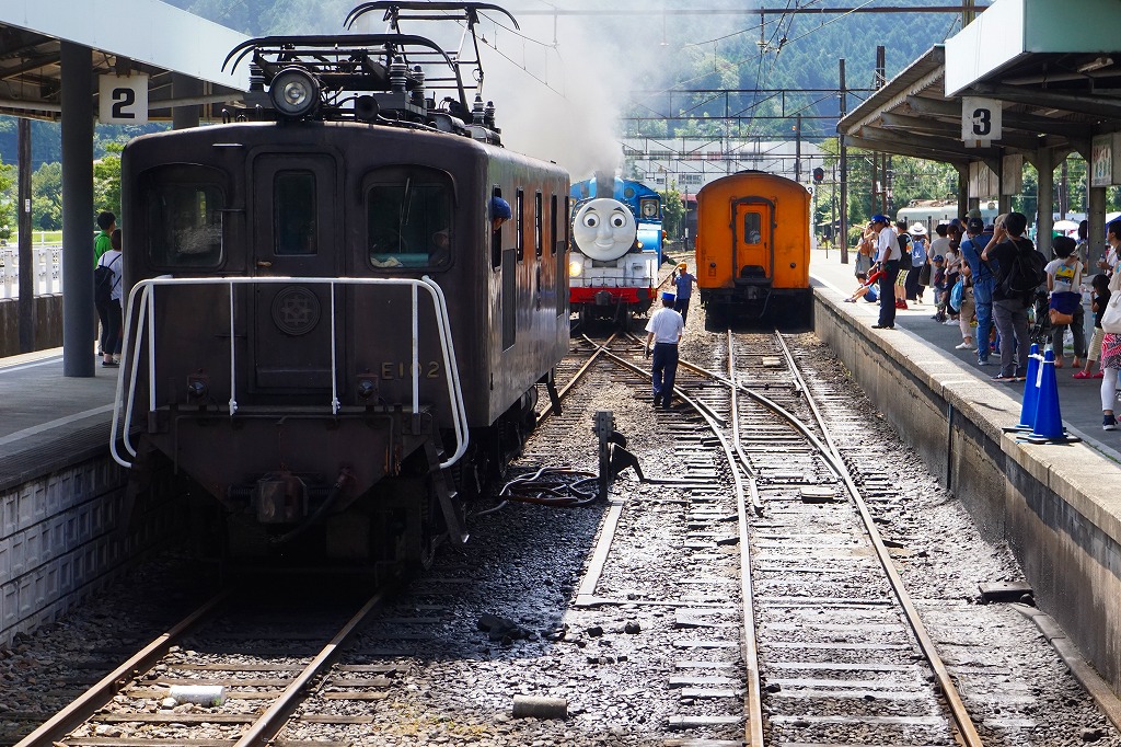 きかんしゃトーマス号は、2014(平成26)年7月12日の運行開始。鉄道会社とソニー・クリエイティブプロダクツとのライセンス契約により、C11形蒸気機関車227号機をトーマスの姿に改装、客車をオレンジ色に塗り替えて、大井川鐵道の新金谷駅〜千頭駅で走り始めた。千頭駅に静置する9600形蒸気機関車49616号機はヒロの姿に。翌2015(平成27)年にはC56形蒸気機関車44号機をジェームスの姿に改装し一日2便化、千頭駅ではC12形蒸気機関車208号機がパーシーになった。2016(平成28)年には路線バス向け小型車両を改装したバスのバーディーが登場し、SL列車と併走し始めた。