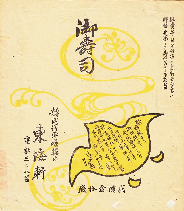 1910年代、大正時代のものと思われる、昔の静岡駅弁の掛紙。収集者は1918(大正7)年のものとしていた。加藤弁当店が三盛軒を経て東海軒となったのは1914(大正3)年4月、1918(大正7)年頃になれば駅弁に調製印が使われるので、この間のものだろう。小鳥に見えるシルエットに、名所案内が記される。
