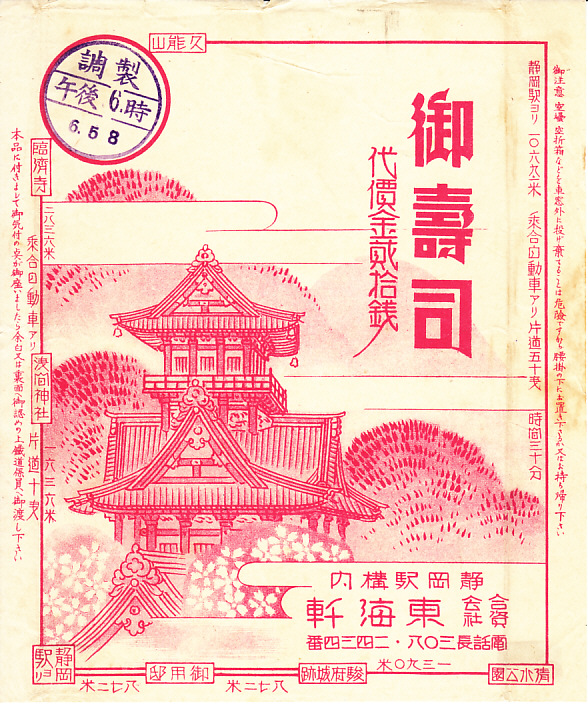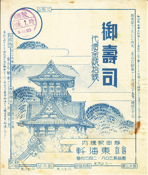 1933(昭和8)年12月20日13時の調製と思われる、昔の静岡駅弁の掛紙。その絵柄は上記の1936年5月や下記の1931年5月のものと同じで、インクが赤でなく青である。何か使い分けでもあったのだろうか。