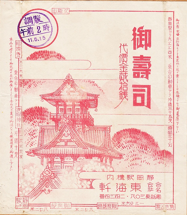 1936(昭和11)年5月15日2時の調製と思われる、昔の静岡駅弁の掛紙。その絵柄は下記の1931年5月のものと同じで、距離や乗合自動車の料金などのアップデートがされている。保存状態にもよるが、なんとなく紙質が落ちた気はする。