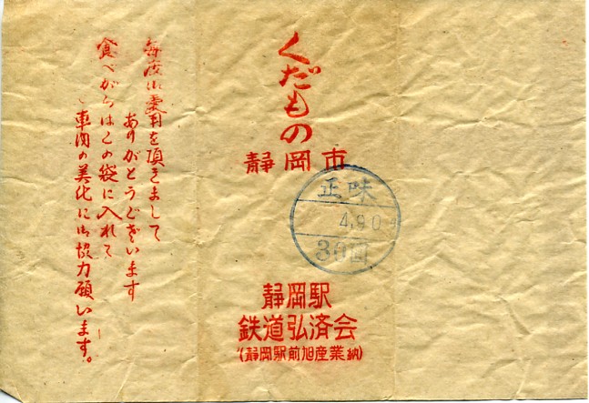 1950年代のものと思われる、昔の静岡駅売り商品の紙袋。品名は「くだもの」としか書かれてないが、中身は何であったのだろう。みかんなら「みかん」と書く気がするし。