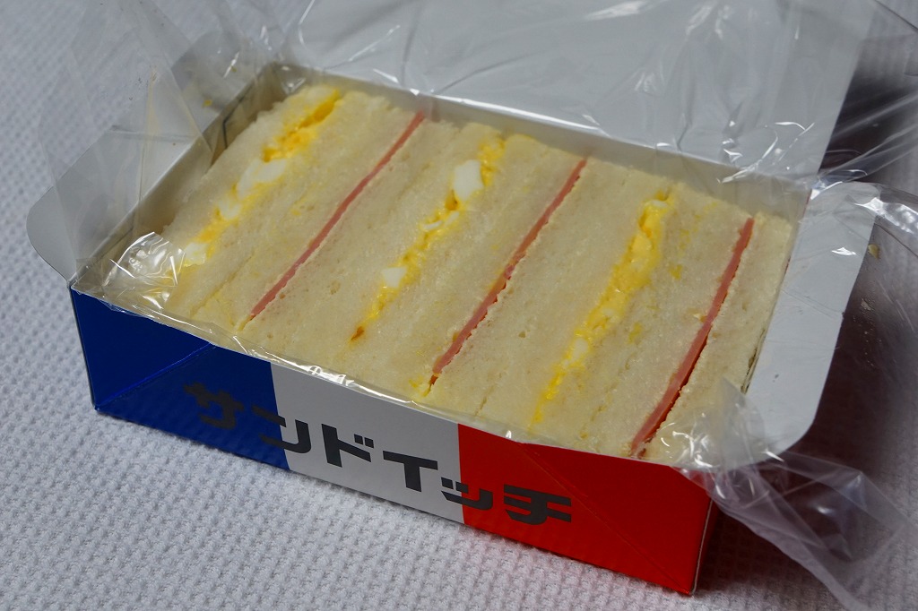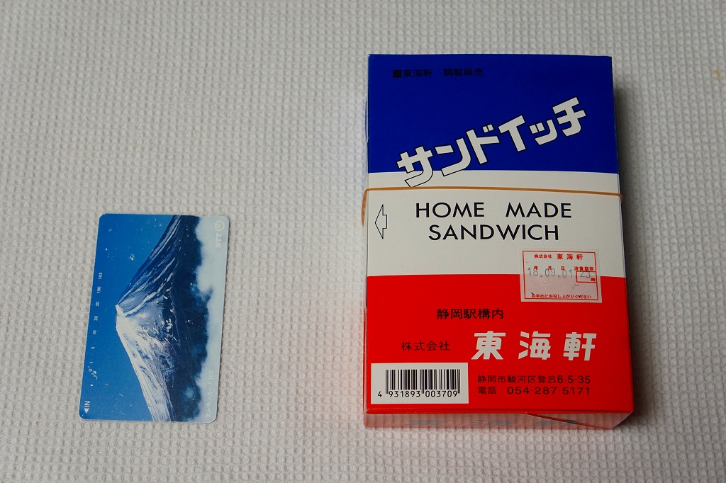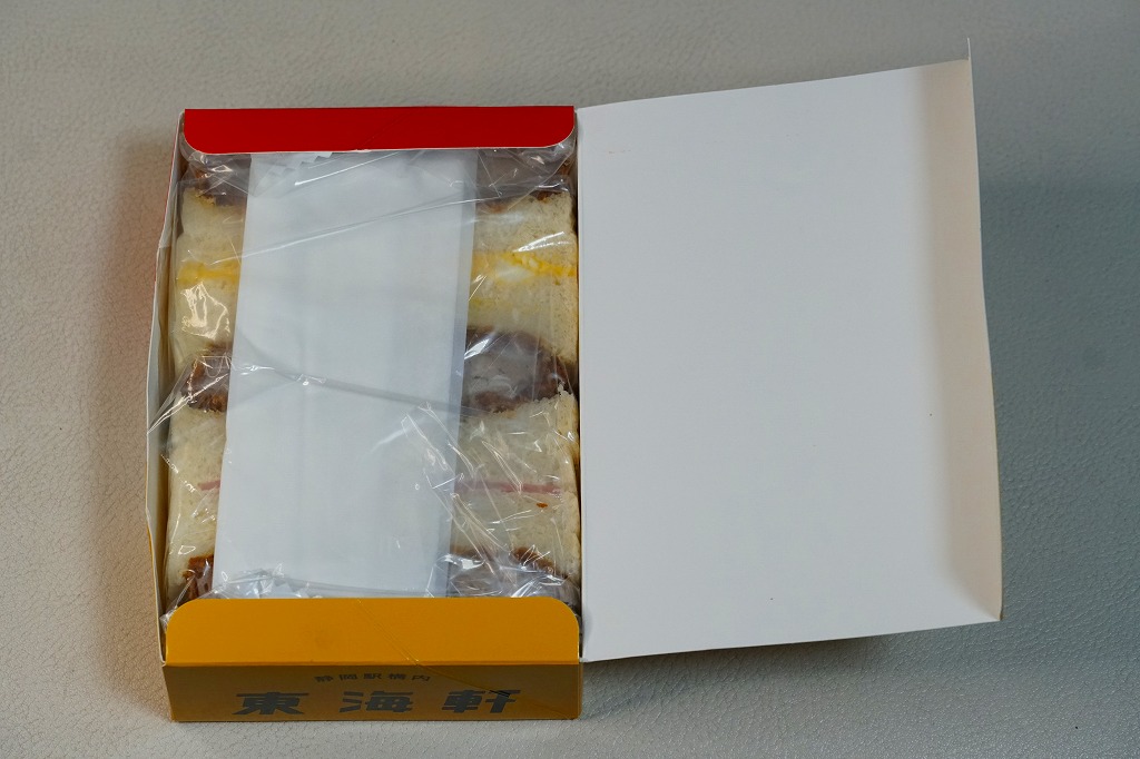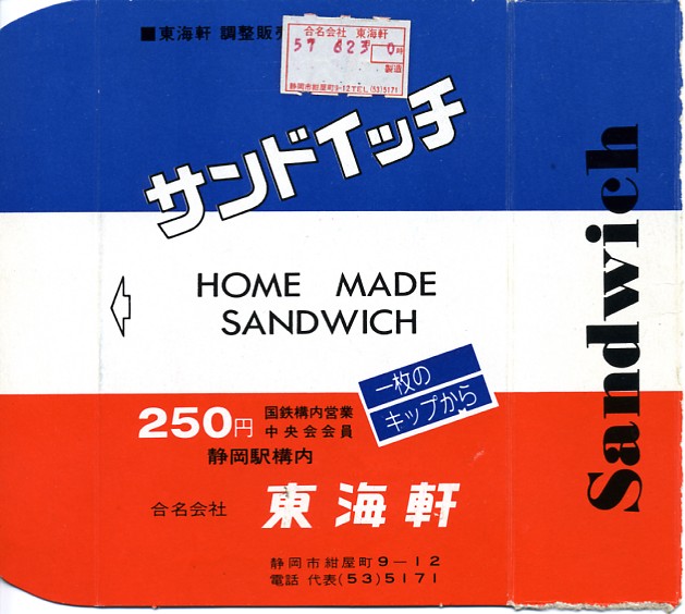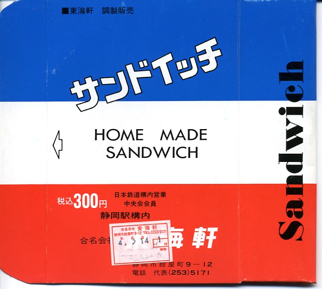 1900(明治33)年の発売という、静岡駅の駅弁屋さんのサンドイッチ。タマゴサンドとハムサンドが3切れずつ、まるごとラップに包まれて、国鉄時代から変わらない絵柄の紙箱に収める。静岡駅では1987年の国鉄分割民営化以降、平成時代にも、東京駅と岐阜県の大垣駅を結ぶ夜行快速列車の発着に合わせ、深夜2時頃の駅弁などのホーム上での販売が実施されていた。価格は2014年4月の消費税率改定で320円、2018年の購入時で340円、2019年2月から360円、2022年4月から450円、2025年時点で500円。