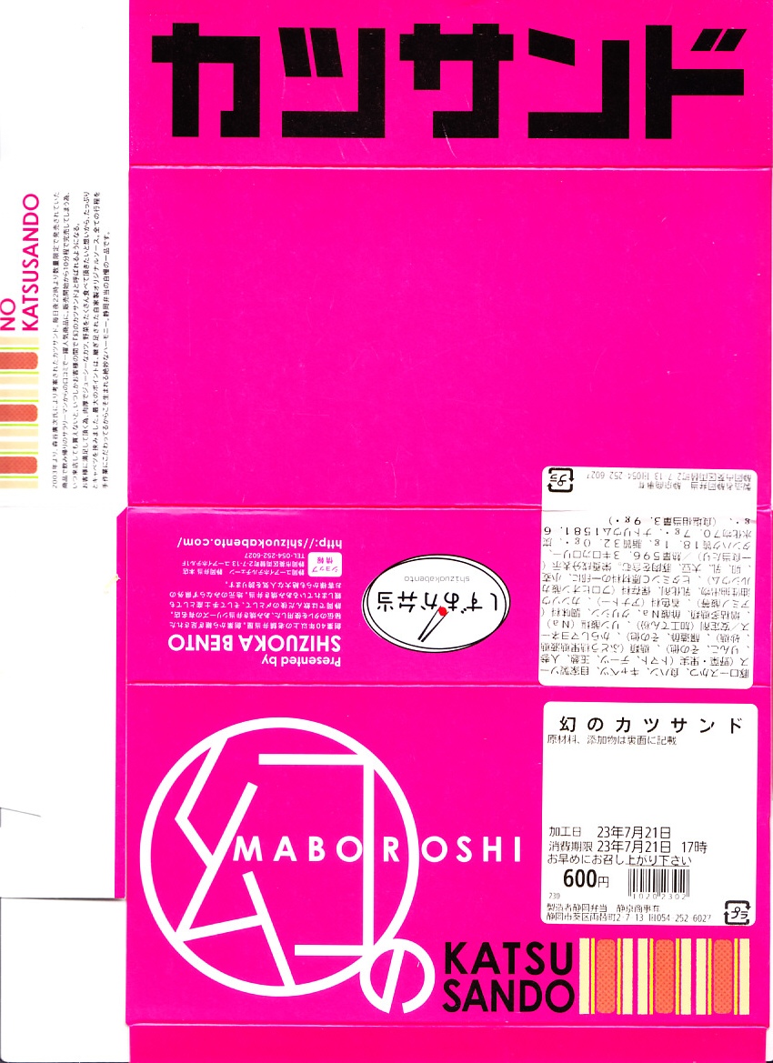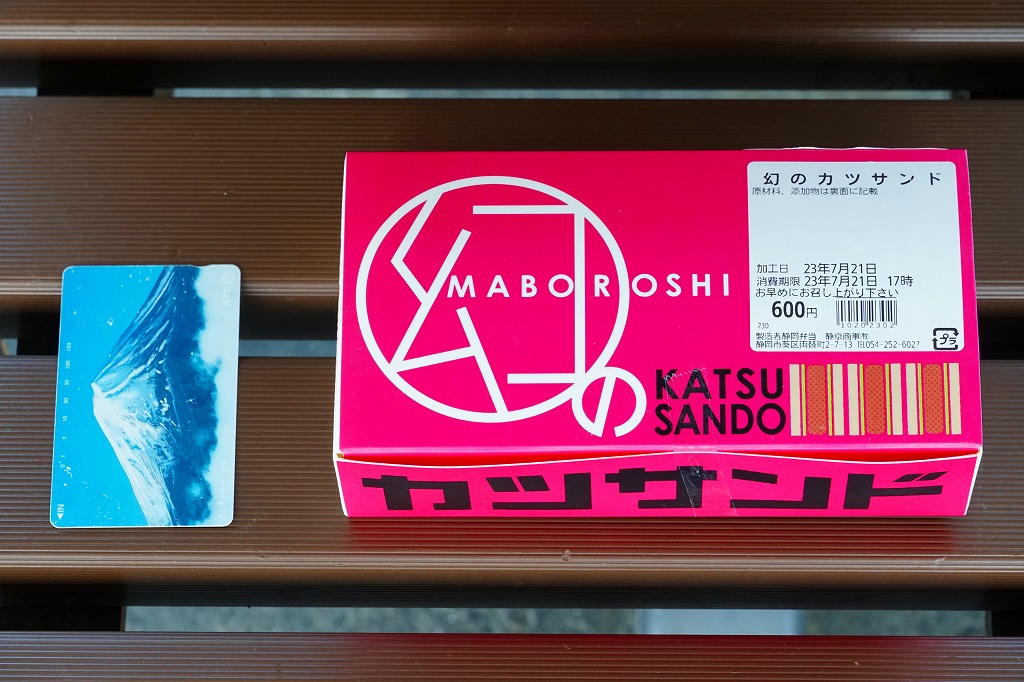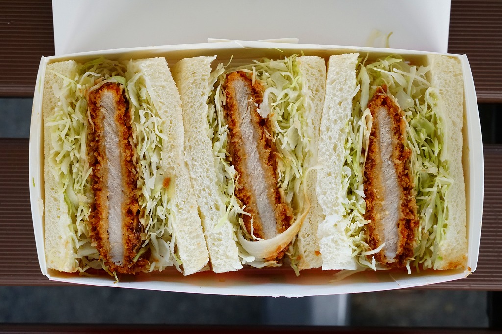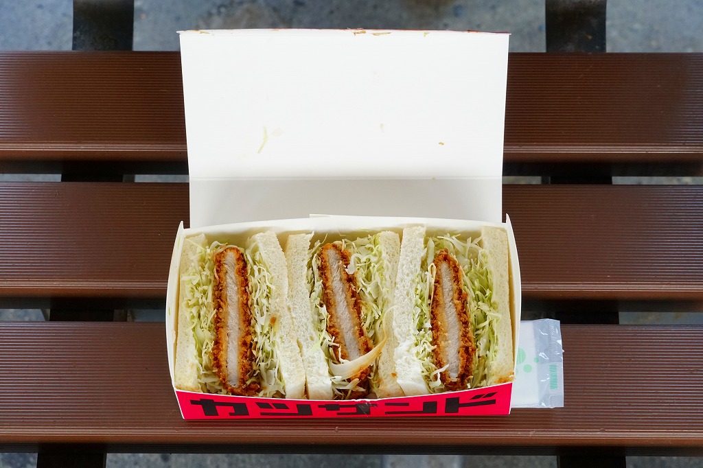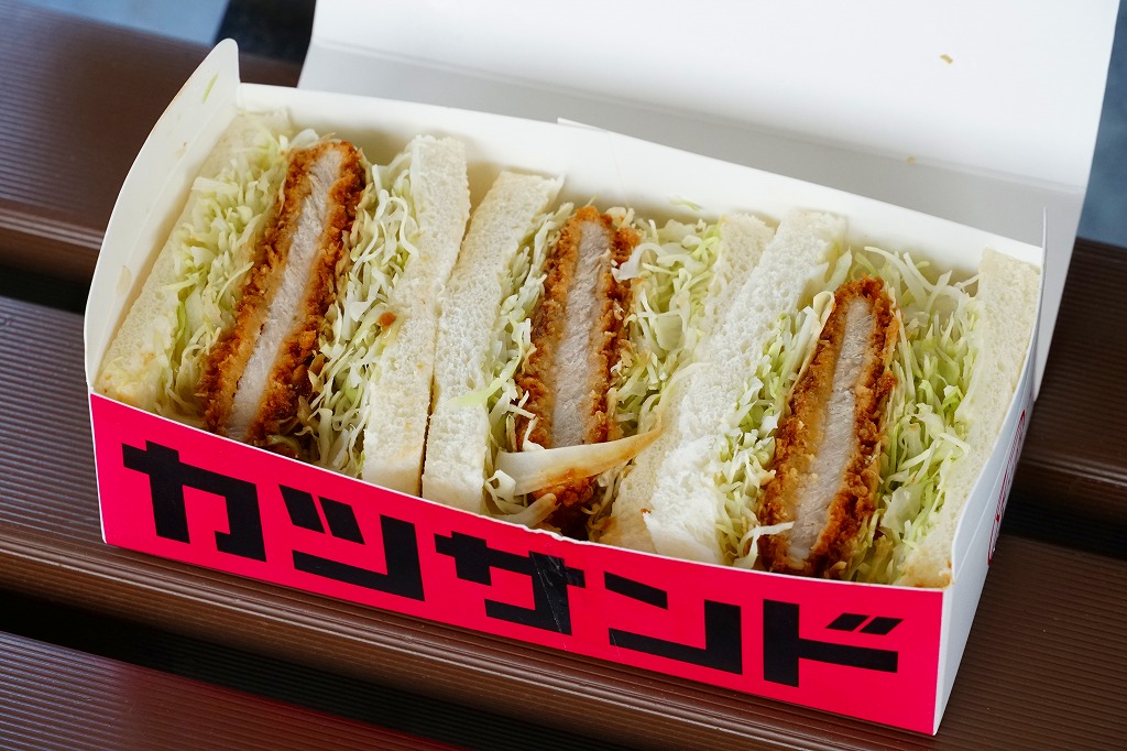 ロースカツのソース漬けと千切りキャベツを耳あり食パンで挟んだカツサンドを3切れ、ピンク色の紙箱に収める。キャベツで分厚く、東京や駅弁の箱サンドより高さもあり、ボリューム感もボリュームもあるカツサンド。トンカツの割合や厚さや脂や味付けが薄めなので、軽めの味で食べやすい。駅では金曜限定かつ売り切れが早そうに見えたので、その点でここでは「幻」かもしれない。価格は2017年時点で550円、2023年5月までには600円。