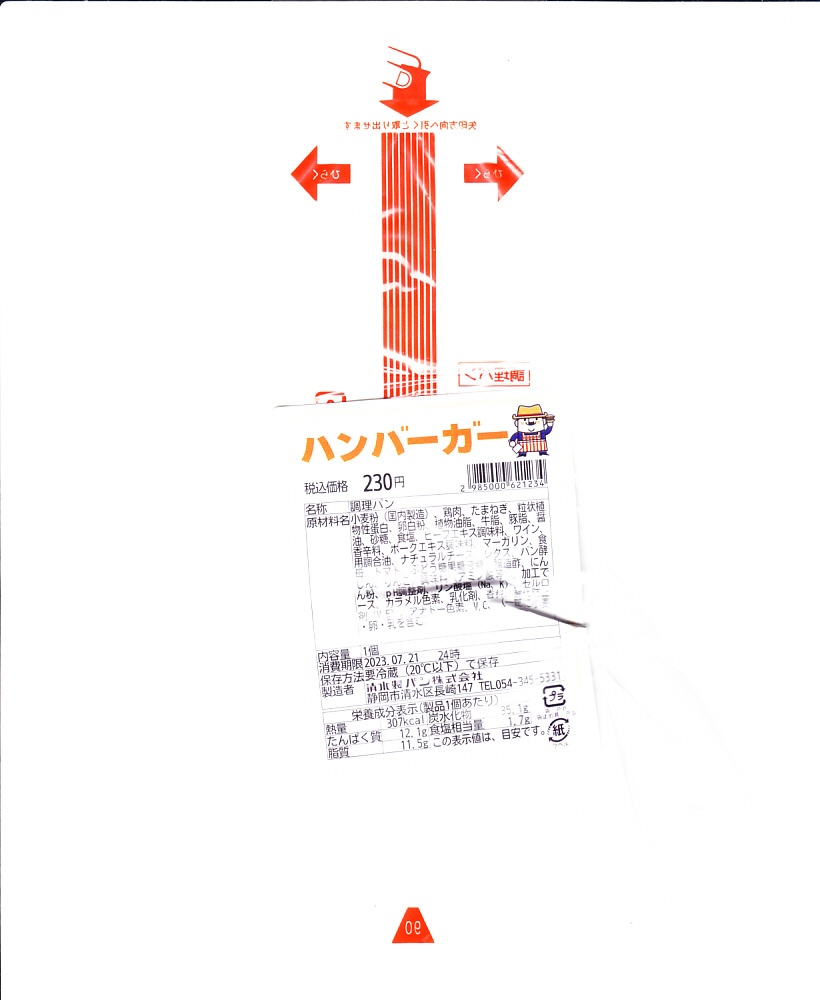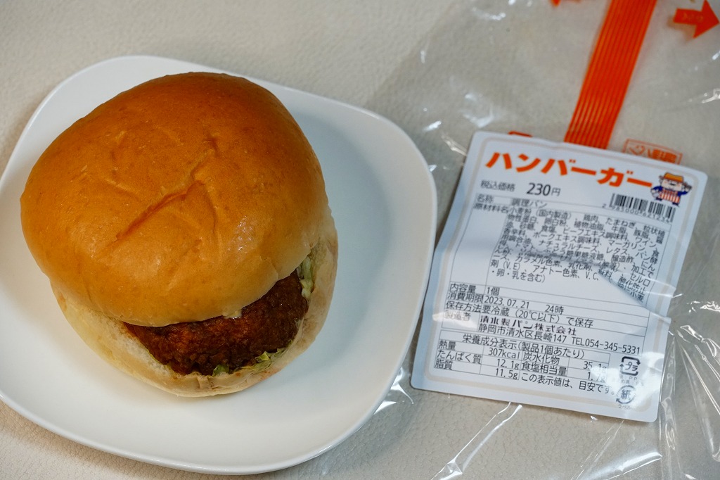 静岡駅のキヨスク系のコンビニや土産物店で売られていた、2種類のハンバーガーのうちひとつ。牛でも豚でもなく鶏肉のハンバーグを、真っ黒のソース漬けにしてレタスとともにバンズで挟み、透明な袋に詰める。上記のまぐろバーガーと違い、こちらは日本全国のコンビニのサンド・おにぎりコーナーで買えるハンバーガーと、何ら変わらない。調製元は静岡県清水で1941年に創業した、学校給食を主力とするパン製造業者。静岡の他駅のキヨスクでも買えるかもしれない。