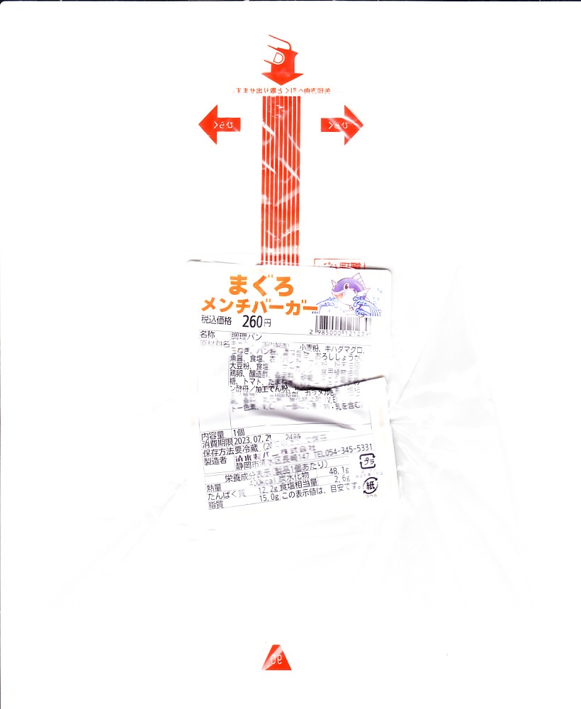 静岡駅のキヨスク系のコンビニや土産物店で売られていた、2種類のハンバーガーのうちひとつ。2000年代にはすでに売られていたらしい。キハダマグロのメンチカツを、真っ黒のソース漬けにしてキャベツとともにバンズで挟み、透明な袋に詰める。マグロは海と港のある日本全国ほとんどの府県で水揚げされ、山奥の旅館でも提供されて日本全国で買えたり食べられる地域性のない食材だが、静岡県は冷凍を含めたマグロ水揚げ日本一を名乗り、まぐろ類缶詰の生産量では全国シェア97%というくらいなので、量や加工で他を圧倒するマグロの産地。このまぐろバーガーも売り場には、名物の扱いでポップが出ていた。普通においしい、お魚フライのハンバーガー。調製元は静岡県清水で1941年に創業した、学校給食を主力とするパン製造業者。静岡の他駅のキヨスクでも買えるかもしれない。