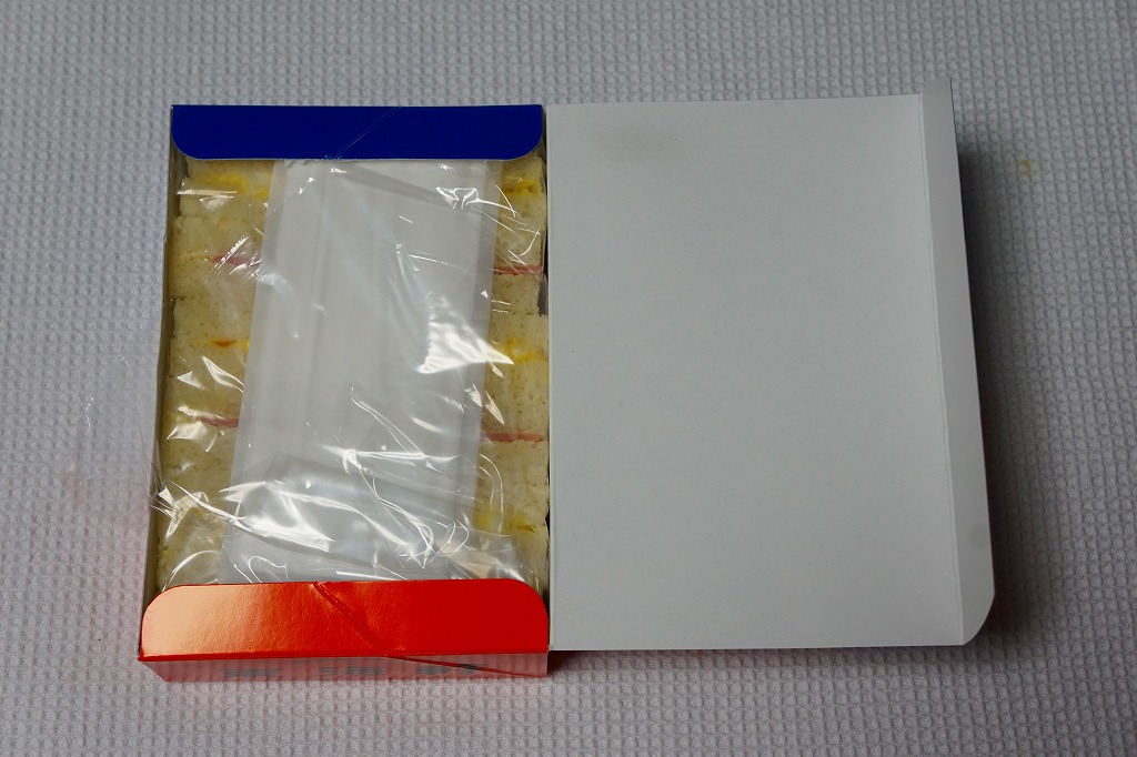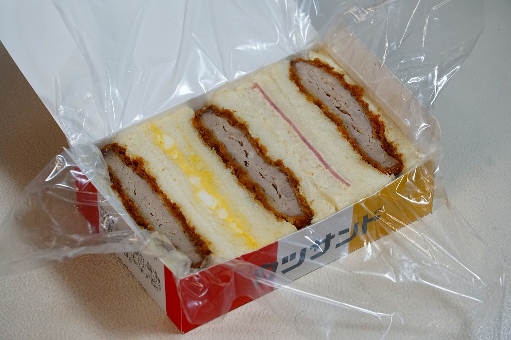 中身はヒレカツサンド3切れ、ハムサンド1切れ、タマゴサンド1切れ。通常のカツサンドは、駅弁でもスーパーでもカツサンドのみを詰めることが多いので、この組合せは独特である。メインのトンカツは、固いや硬いでなく「堅い」と表現したい締まり具合で、灰色と歯応えや形状がワイルドに思えた。価格は2013年時点で650円、2015年時点で670円、2019年2月から700円、2022年4月から750円、2023年7月から800円。