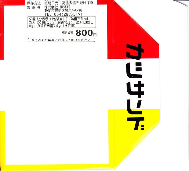 2006年7月23日に購入した、静岡駅弁のパッケージ。上記の2012年のものと比べて、中身と価格と商品名は変わっていないが、ボール紙製容器の構造が違い、その絵柄も微妙に異なる。駅前再開発に伴い調製元が移転したため、その所在地や電話番号も異なる。