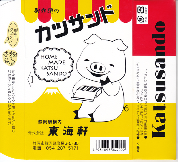 2012(平成24)年11月の発売か。21世紀の新商品であるにもかかわらず、見た目は昭和時代そのもの。静岡駅で伝統の駅弁「サンドイッチ」と同じ構造の紙箱に、レトロと表現されそうなデザインで、豚と富士と商品名と会社名を描く。