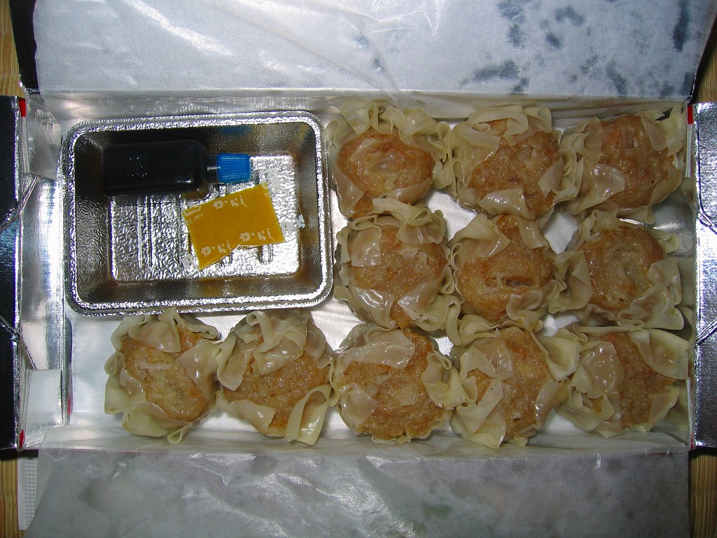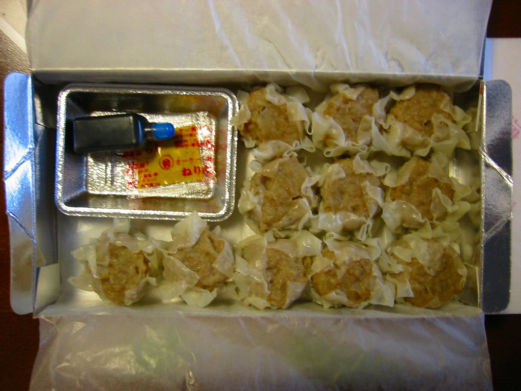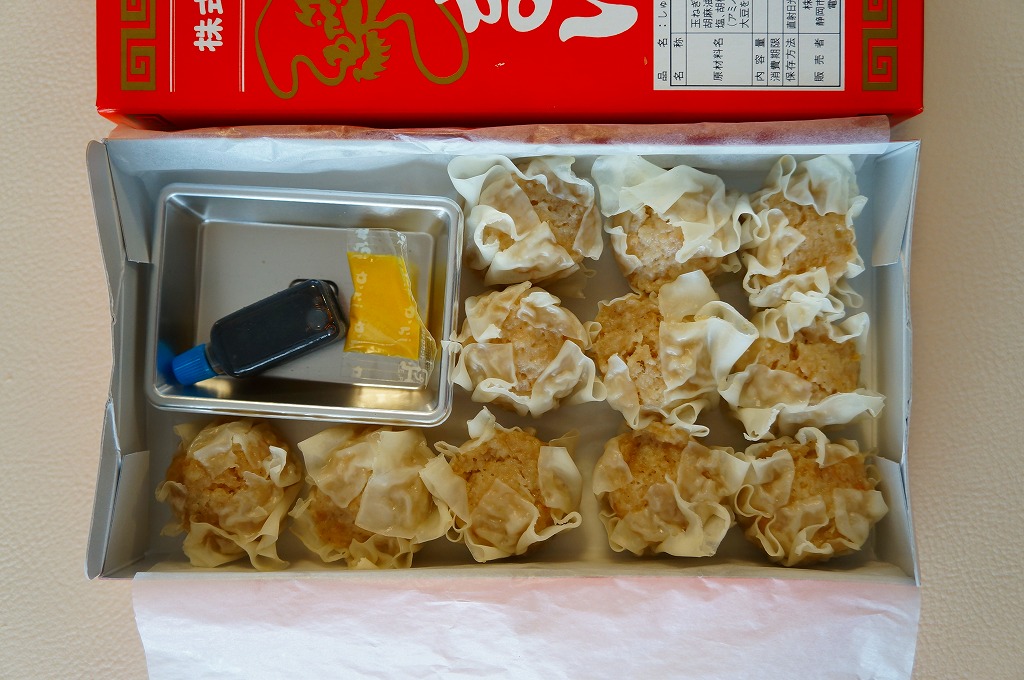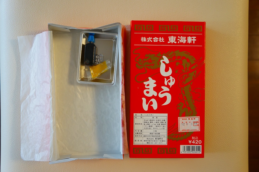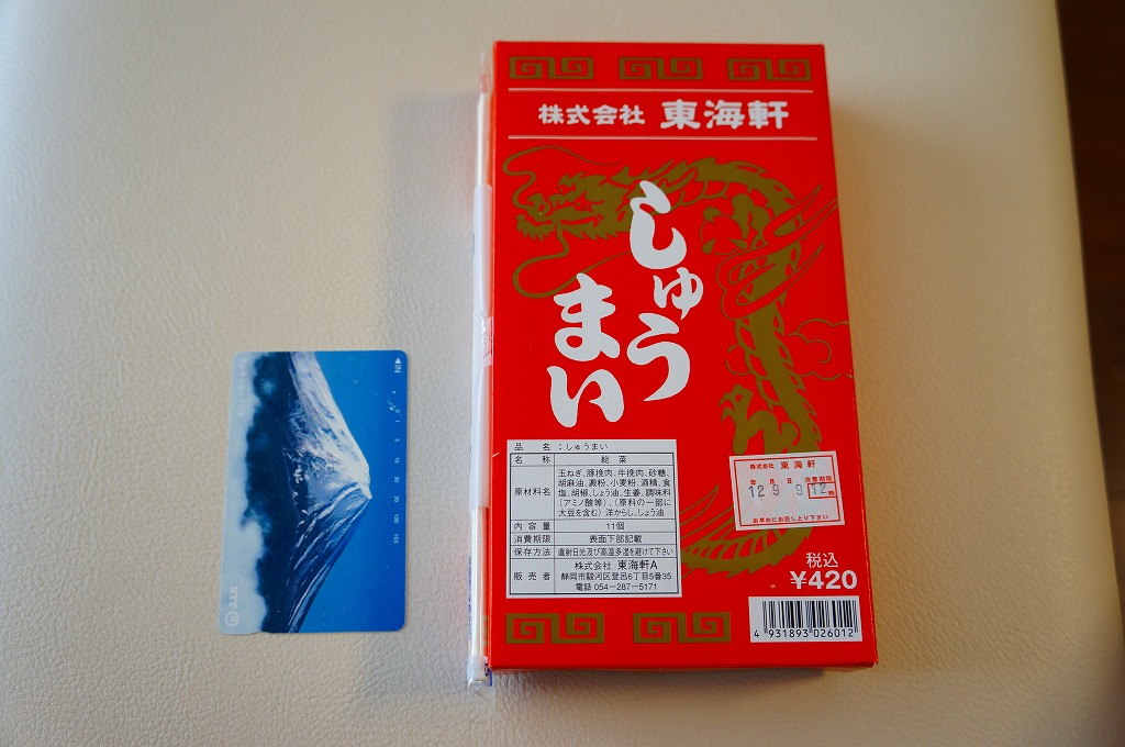 静岡駅伝統の駅売り焼売。赤い紙箱に肉焼売が11個入っている。焼売は横浜や小田原のものとほぼ同じサイズで、やや柔らかく大味な感じがする。今では東海道本線沿線を除くと札幌と鳥栖でくらいしか見られなくなった、駅弁スタイルの駅売り焼売。2015年頃までの販売か。