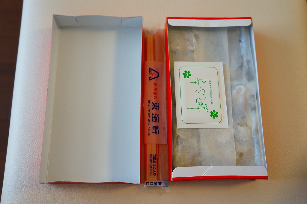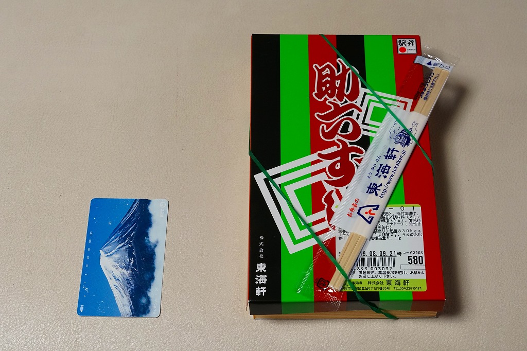 2015(平成27)年9月5日に購入した、静岡駅弁の紙箱。上記の2023年のものと同じ。違いを探せば、価格、食品表示ラベルの形式、おてふきの形状。