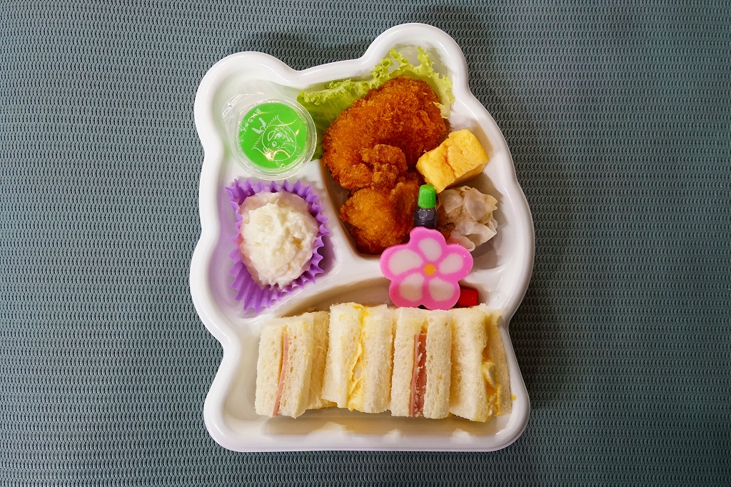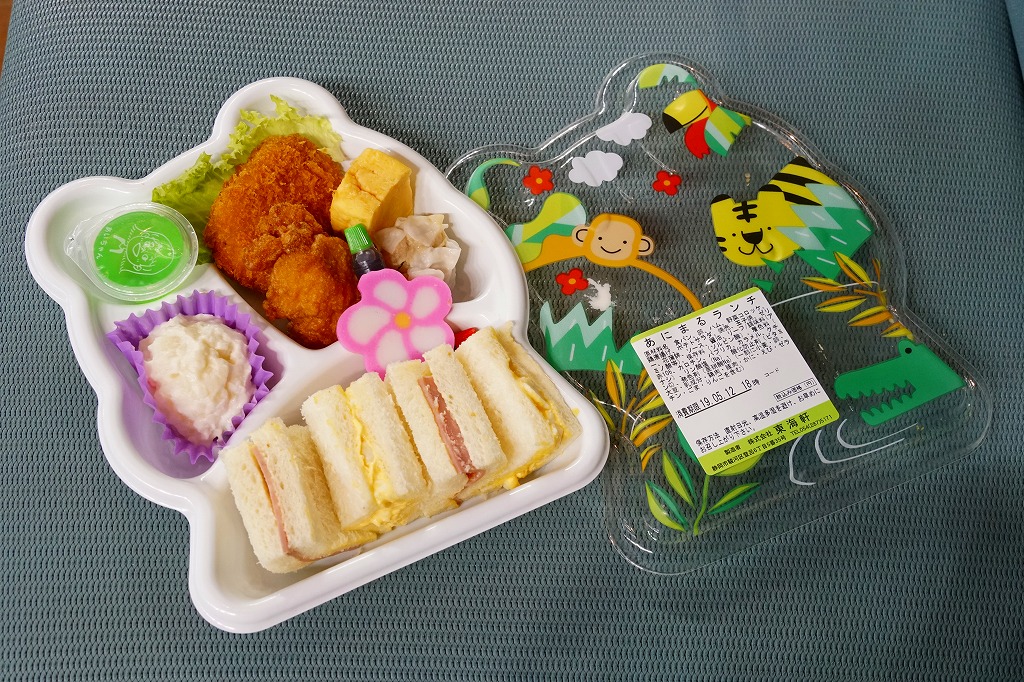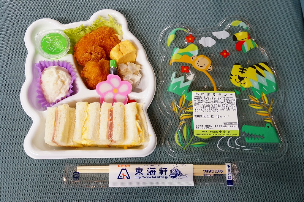 静岡駅の駅弁屋がつくる惣菜か。サルやトラやワニなどを描く動物園柄と思われる市販の惣菜向け変型プラ容器に、ハムサンドとタマゴサンド、ポテトサラダ、鶏唐揚と野菜コロッケと焼売とリーフ、ミニゼリーを詰めたミニ行楽弁当。イベントで購入したが、これは駅売り弁当なのだろうか。そんな商品に添付した駅弁と同じ割りばしの、汽車が走る重厚な絵柄が浮いていた。