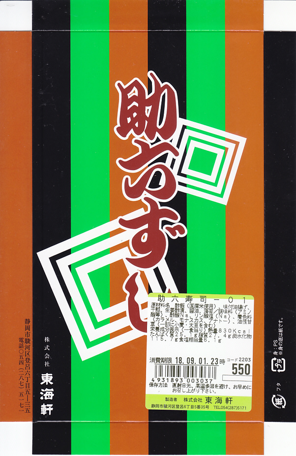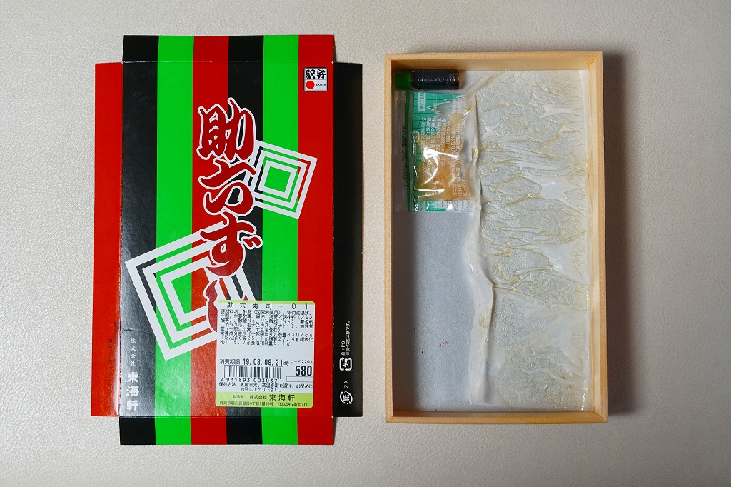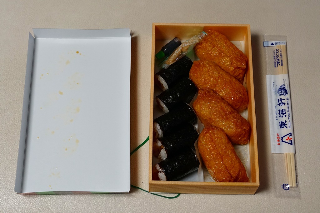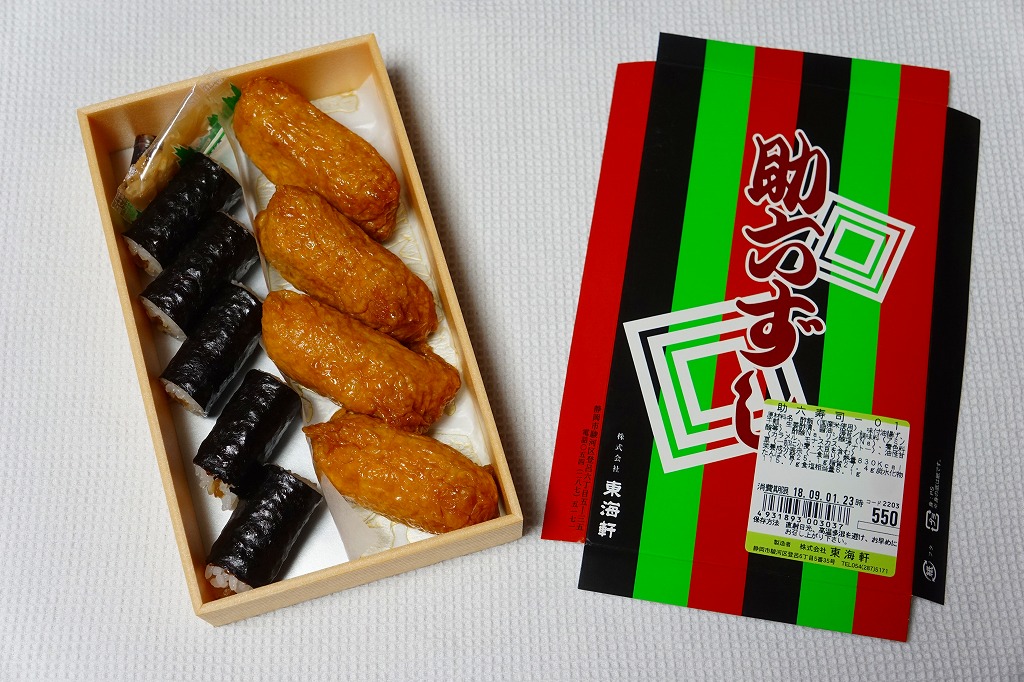 静岡駅で昔から売られているであろう、助六寿司の駅弁。浅い折箱に細身のいなりずし4個と、かんぴょうの細巻き5個を並べ、ガリの袋と醤油のボトルを添付するだけ。味も没個性。ふたの絵柄を含めて見栄えを飾らない、豊橋駅や草津駅や伊東駅など、東海道エリアで時に話題となる稲荷寿司駅弁と違い、まったく話題に上がらない、そんな惰性に感心させられる。価格は2018年時点で550円、2019年2月から580円、2022年4月から650円、2025年4月から720円。