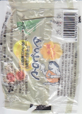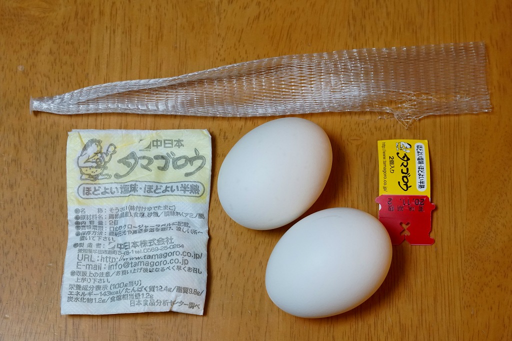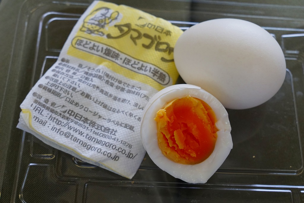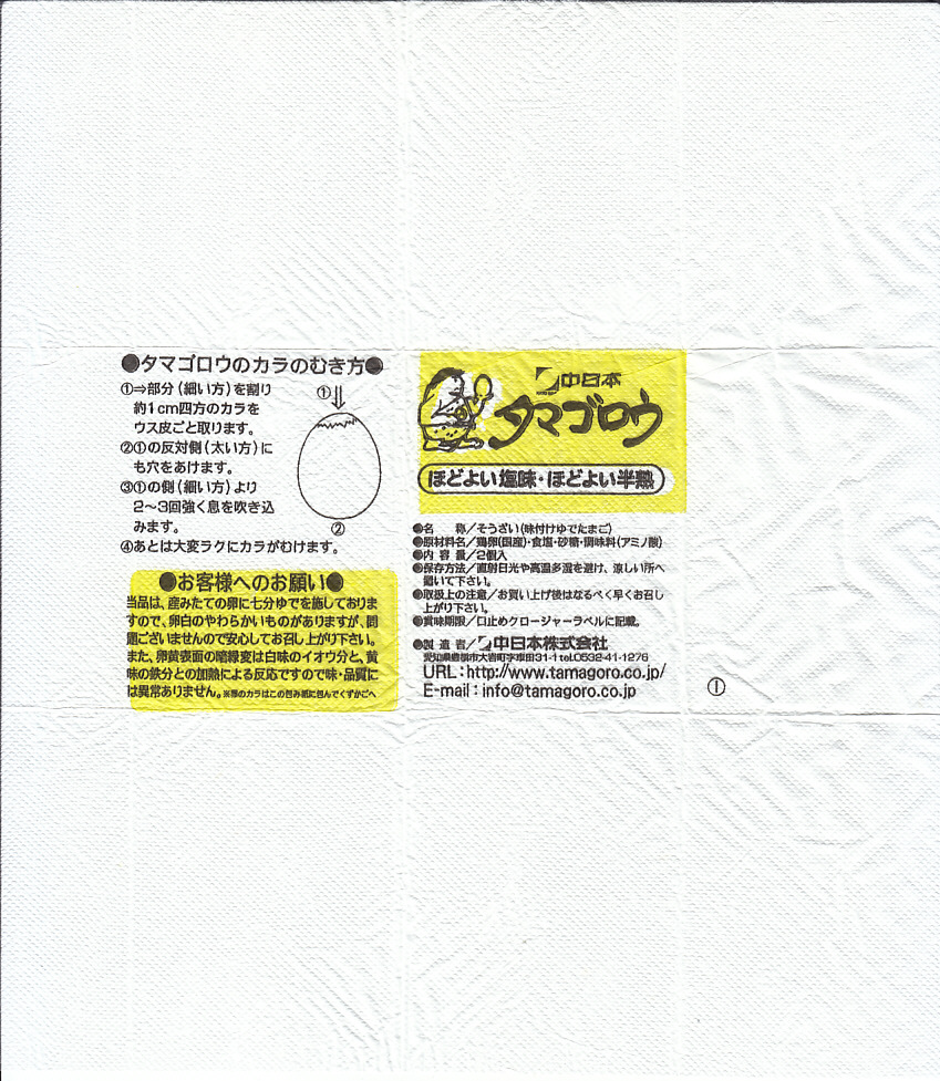 東海地方や西日本のキヨスクやコンビニなどで売られる、愛知県の味付けゆで卵で、昭和50年代の発売。その存在は、東日本の「マジックパール・カル」に相当するものだろう。静岡駅の駅弁売店で買った今回のものは、塩味が付いたゆで卵を2個、プラ製のネットに収めたもの。紙箱入りや1個入りのものもある模様。私が食べ慣れたマジックパールより、ざらついた感じを受けた。添付の包み紙に記される「タマゴロウのカラのむき方」の内容が独特。