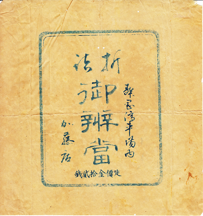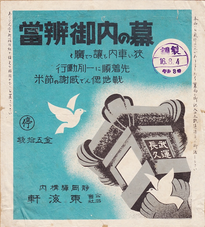 1941(昭和16)年8月4日20時の調製と思われる、昔の静岡駅弁の掛紙。下記の1941年4月の「まくのうち御辨當」と、同じ読みと価格を持つので、同じ駅弁なのだろう。平時の絵柄は消え、武運長久の灯籠と3行ほどの標語を記す。