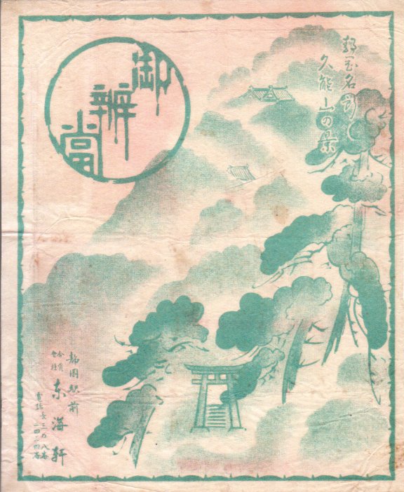 昭和10年代、1935年頃以降のものと思われる、昔の静岡駅弁の掛紙。デザインは徳川家康の墓がある久能山。鉄道に関する注意書きなどがないため、駅弁でなく市販の弁当向けの掛紙かもしれない。