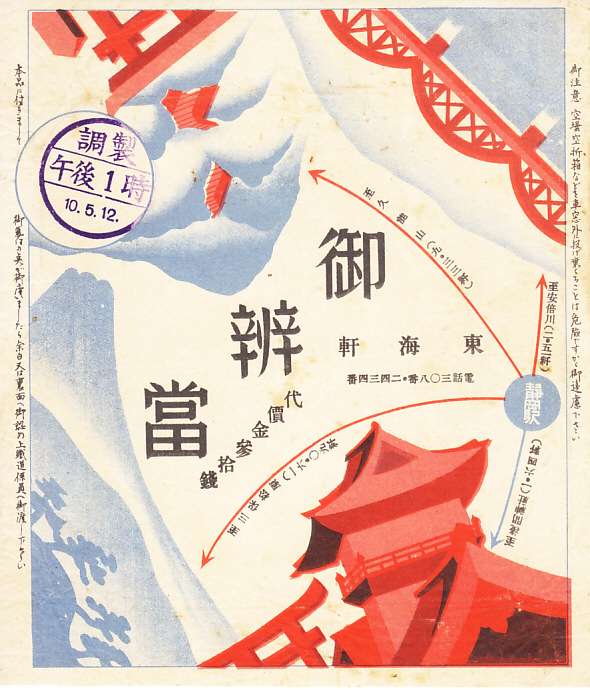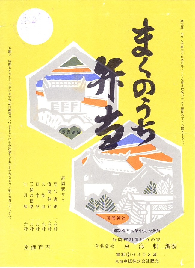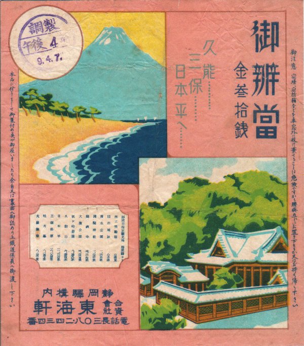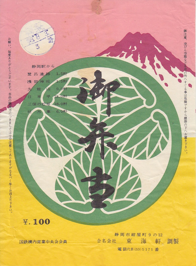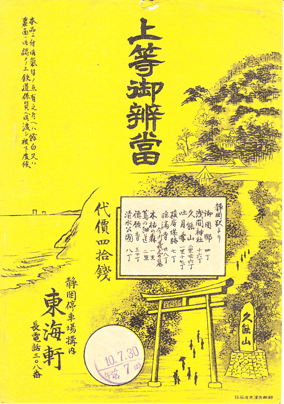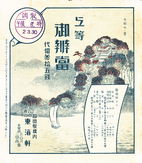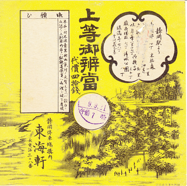 1934(昭和9)4月7日16時の調製と思われる、昔の静岡駅弁の掛紙。調製元の東海軒は1934(昭和9)年3月12日から合名会社だそうで、すると合資会社のこれは1920(大正9)年の掛紙に思えるが、その頃の静岡駅弁の掛紙は「静岡停車場構内」とあり2434番の電話番号がないため、これは昭和のものと思われる。観光が多様化し、いわゆる名所旧跡の存在感が薄くなった現在では、「久能…三保…日本平へ…」と書かれても、それはどこ?などと言われそう。