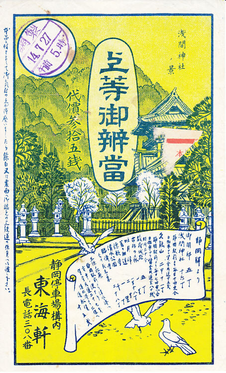 1925(大正14)年7月25日5時の調製と思われる、昔の静岡駅弁の掛紙。静岡市街に現存する、静岡浅間神社を描く。