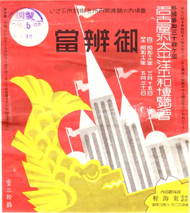 1937(昭和12)年5月19日の調製と思われる、昔の静岡駅弁の掛紙。1937年3月から5月まで名古屋で開催された、名古屋汎太平洋平和博覧会の文字と会期と光景にしゃちほこを描いた、まるで名古屋駅弁のような絵柄の掛紙。浜松駅の掛紙と同じ絵柄。