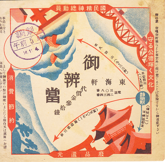 1941(昭和16)年4月17日11時の調製と思われる、昔の静岡駅弁の掛紙。下記の1940年頃の特製御辨當(50銭)と、同じ絵柄と価格を持ち、名前が異なる。1939(昭和14)年9月の価格等統制令に基づく価格停止品を示すマル停マークが付き、四隅に「國民精神總動員」「守る公梛Pく文化」「廢品還元」「消費節約」を加え、平時から戦時に変わったことを示す。