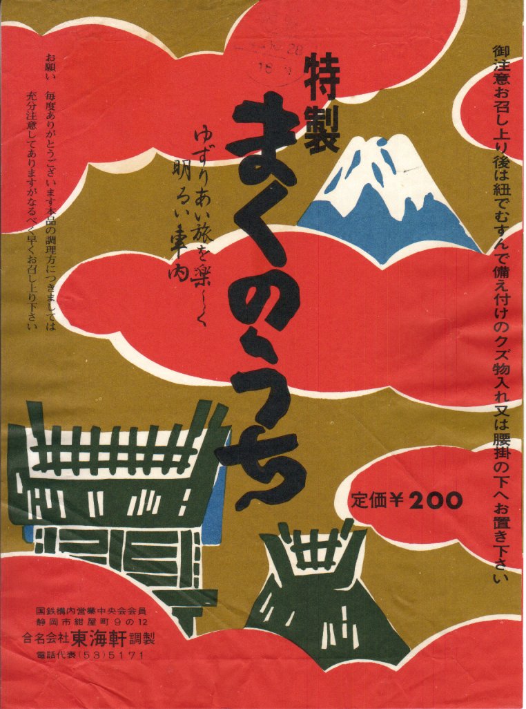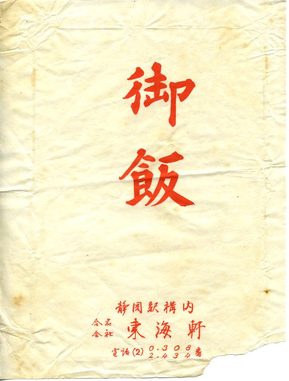 1940年頃、昭和10年代のものと思われる、昔の静岡駅弁の掛紙。価格の50銭は、戦前の駅弁としては破格の高値。雪廼舎閑人「汽車辨文化史」によると、1938(昭和13)年5月に静岡駅弁の東海軒にのみ、50銭の特製辨當の販売が認められたという。