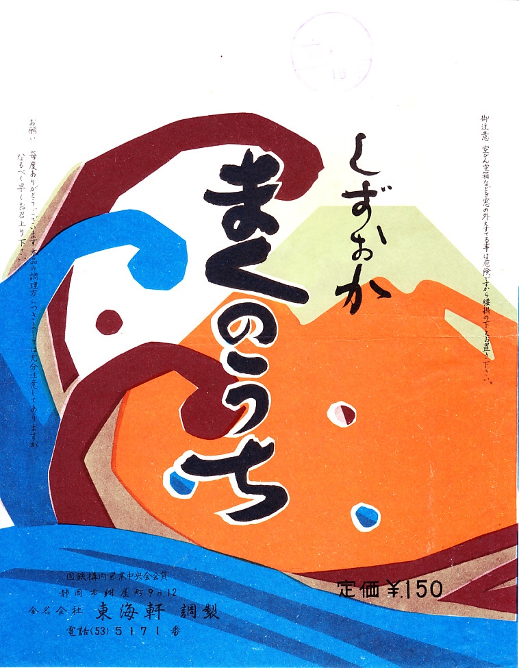 1956(昭和31)年4月4日12時の調製と思われる、昔の静岡駅弁の掛紙。富士とミカンなどを描く。幕の内駅弁の相場が100円だった時代に、150円も取る文字通りの特製弁当だったのだろう、御飯とおかずのそれぞれに掛紙が付いていたと思われる。
