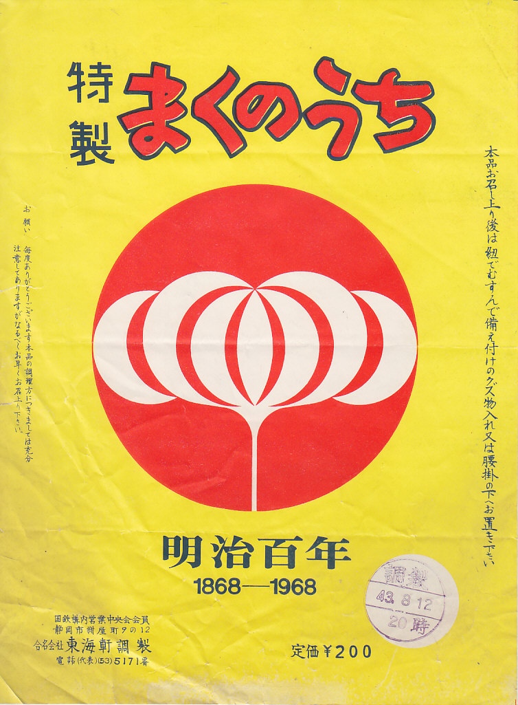 1968(昭和43)年8月12日(月)20時の調製と思われる、昔の静岡駅弁の掛紙。明治百年のロゴマークを赤く大きく描いた、記念の掛紙。