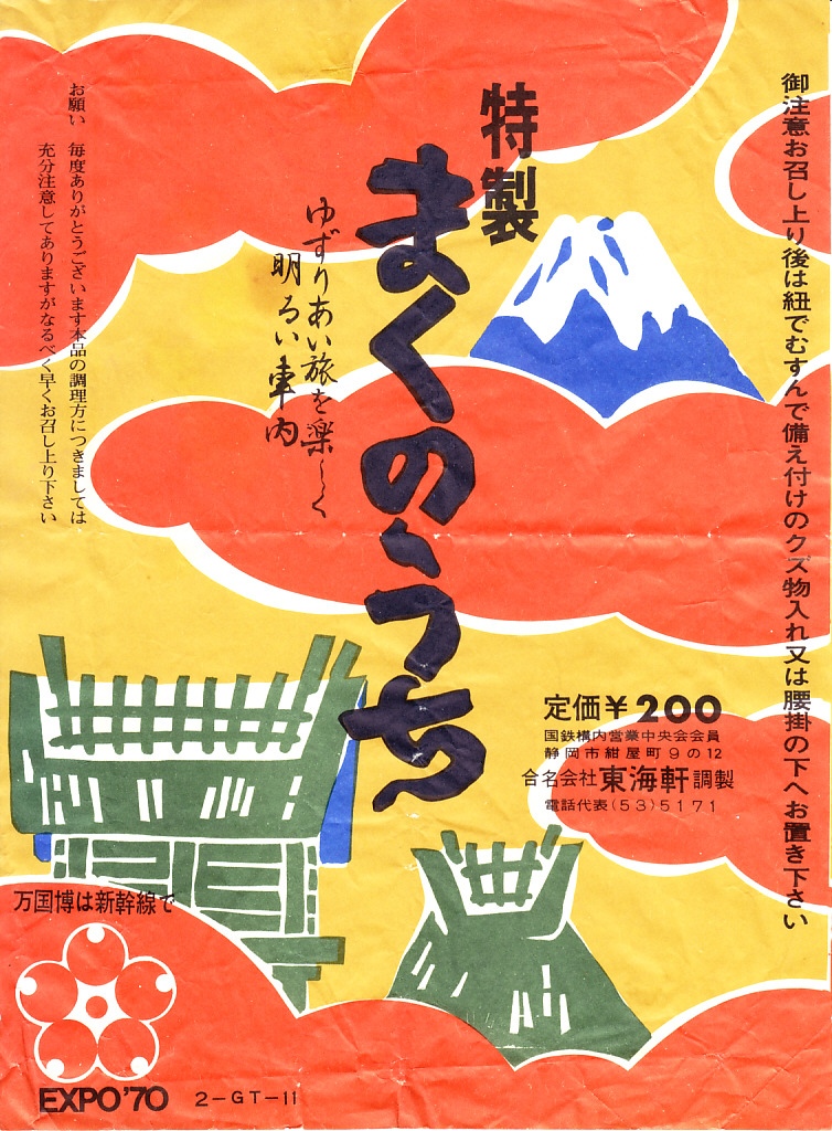 1970(昭和45)年4月29日(水祝)の調製と思われる、昔の静岡駅弁の掛紙。絵柄は上記の1970年10月のものと同じで、こちらには万博マークが入る。