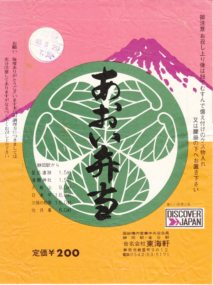 1973(昭和48)年5月29日(火)7時の調製と思われる、昔の静岡駅弁の掛紙。静岡にゆかりの深い徳川家康の三つ葉葵紋が、掛紙に描かれ、駅弁の名前になった。しかしこの名の駅弁は、あまり長くは売られなかった模様。