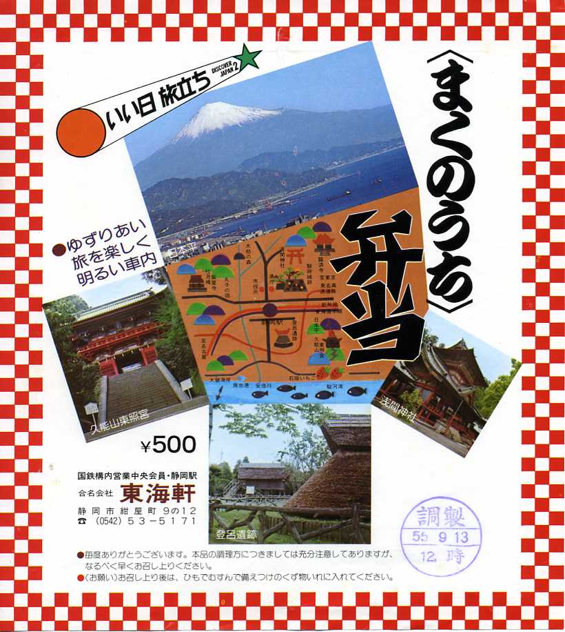 1980(昭和55)年9月13日12時の調製と思われる、昔の静岡駅弁の掛紙。絵柄は上記の1981年2月のものと、まったく同じ。まくのうちに括弧<>を付けたのは、何か意味があるのだろうか。