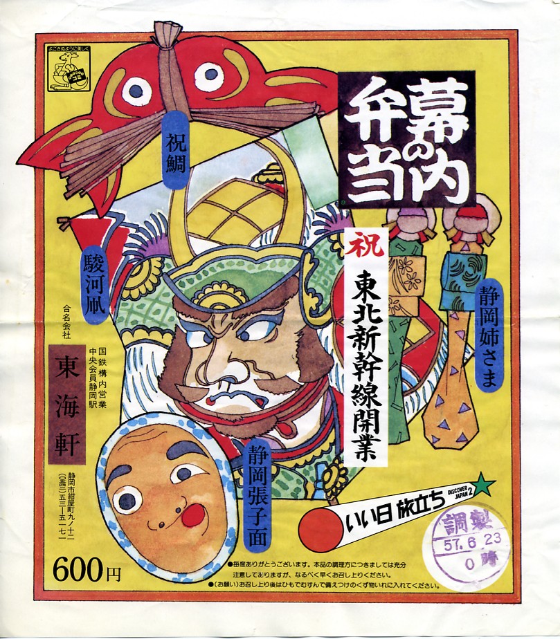 1982(昭和57)年6月23日0時の調製と思われる、昔の静岡駅弁の掛紙。調製日は東北新幹線の大宮駅から盛岡駅までの開業日。掛紙でこれを祝っているが、静岡とはあまり関係のないことだとは思う。この絵柄は2019年時点でも、静岡駅の幕の内弁当に使用されている。