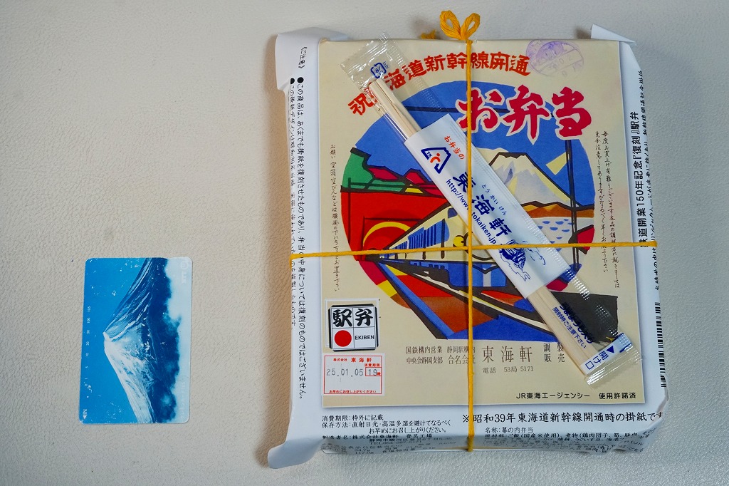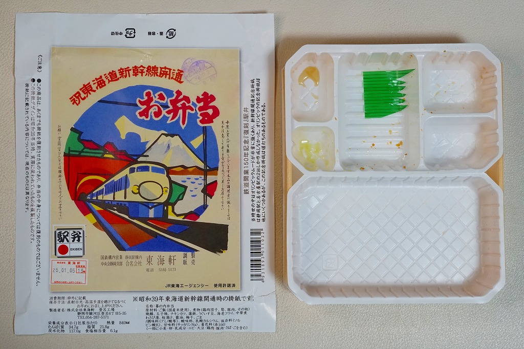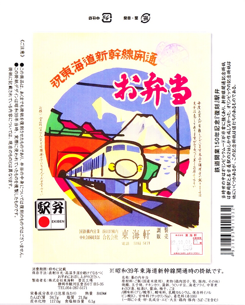 2022(令和4)年10月9日に購入した、静岡駅弁の掛紙。日本鉄道構内営業中央会の鉄道開業150年記念復刻駅弁企画により、同月から期間限定で販売された31社34駅弁のひとつ。10月8日から23日までの予定で、静岡駅にて販売された。掛紙の絵柄に、1964(昭和39)年10月の東海道新幹線開通時のものを取り入れた。それ以外は普段の「幕の内弁当」と同じ。