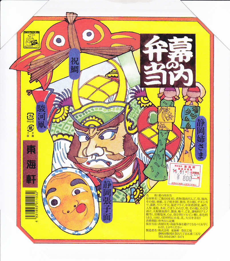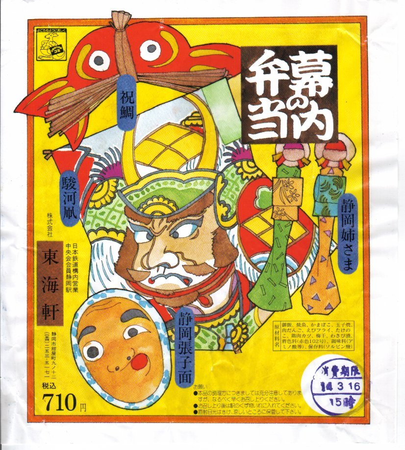2015(平成27)年1月11日に購入した、静岡駅弁の紙ぶた。絵柄は下記の2002年3月のものと変わらないが、掛紙が厚紙のふたに変わり、消費期限の捺印がシールに変わった。いずれも駅弁収集の世界では改悪とされる。また、駅前再開発にかかった調製元の移転により、所在地や電話番号が変わった。