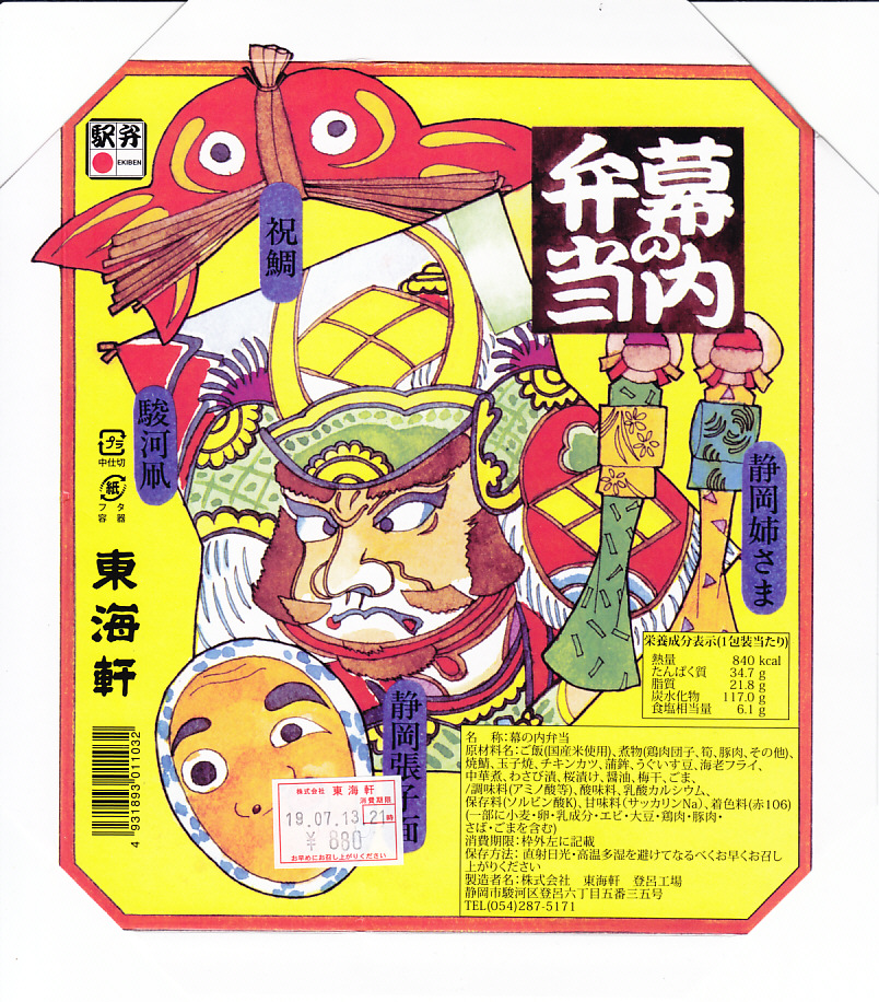 2019(令和元)年7月13日に購入した、静岡駅弁のふた。昭和時代から変わらない絵柄は健在。法令の強化で食品表示がまた増えた。調製元が日本鉄道構内営業中央会に復帰したようで、掛紙に同会の駅弁マークが付くようになった。
