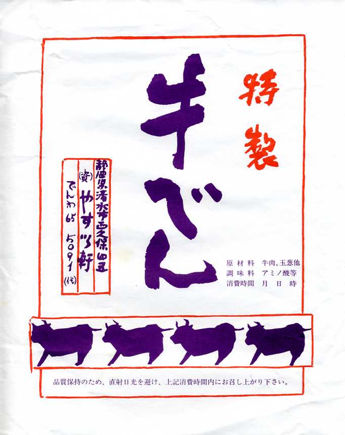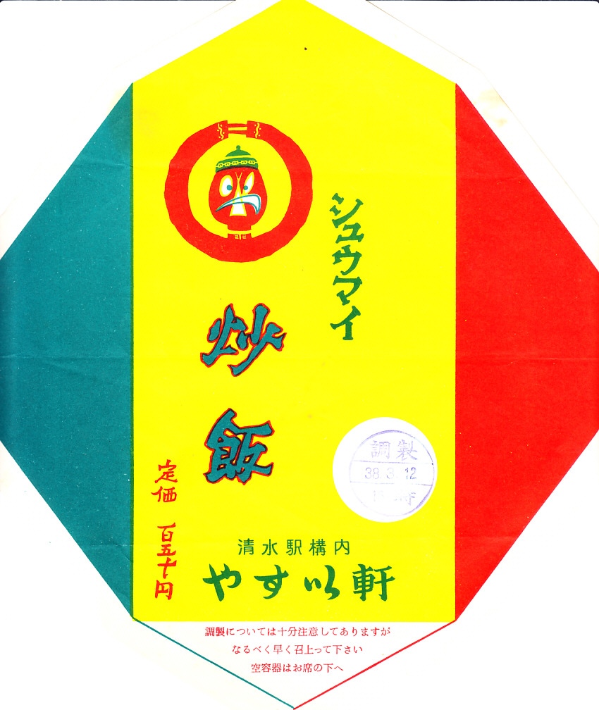 1963(昭和38)年3月12日の調製と思われる、昔の清水駅弁の掛紙。1960年代から1970年代までの、清水駅弁の看板商品。その名前に、同じくシウマイや焼飯が知られた横浜駅を含め、他の駅にない色彩が特徴。清水も横浜も貿易で栄えた港町で、いずれも中華料理が得意な駅弁屋というのが興味深い。