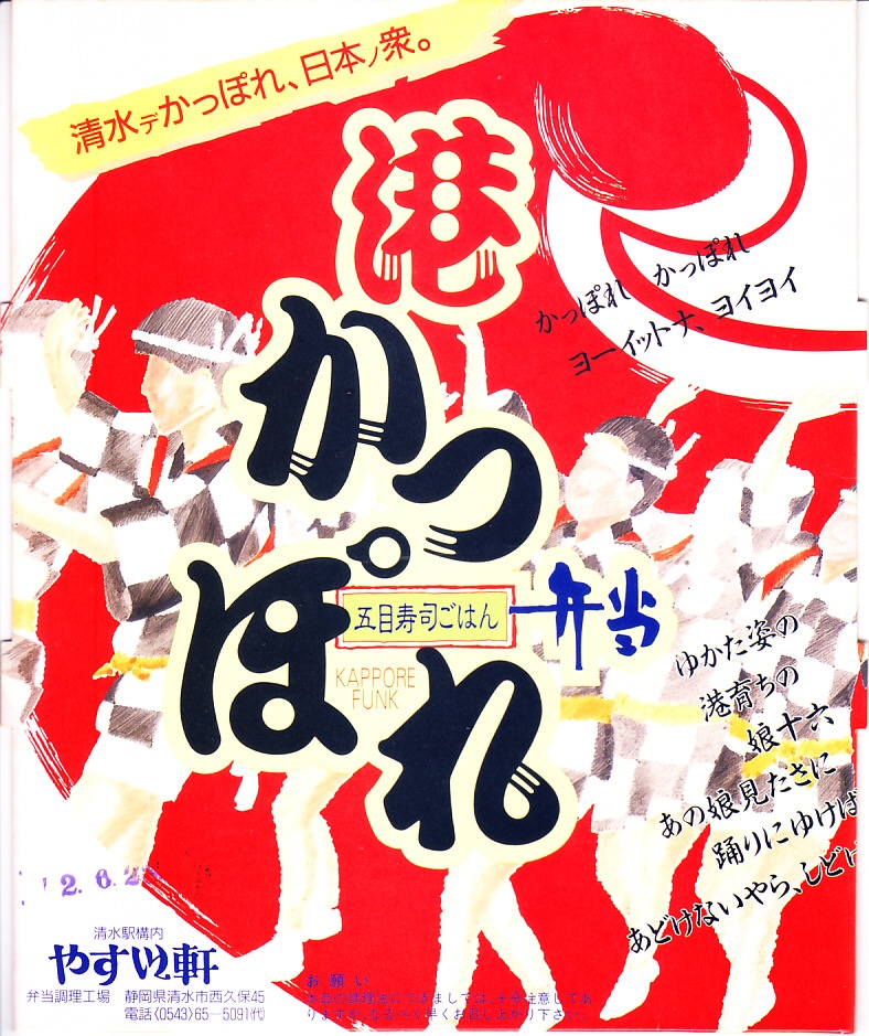 1990(平成2)年6月不明日の調製と思われる、昔の清水駅弁のふた。清水みなと祭りにちなみ、「かっぽれ」と呼ばれる総おどりの光景を描く。この弁当は1991年頃の清水駅弁であったほか、2004年7月に大規模イベント向けの仕出し弁当として1,000円で発売された記録がある。五目寿司ごはんを使った、海産物を多く含む特製幕の内駅弁だったらしい。