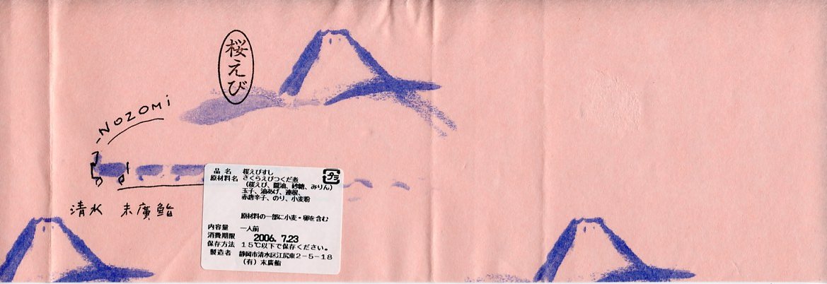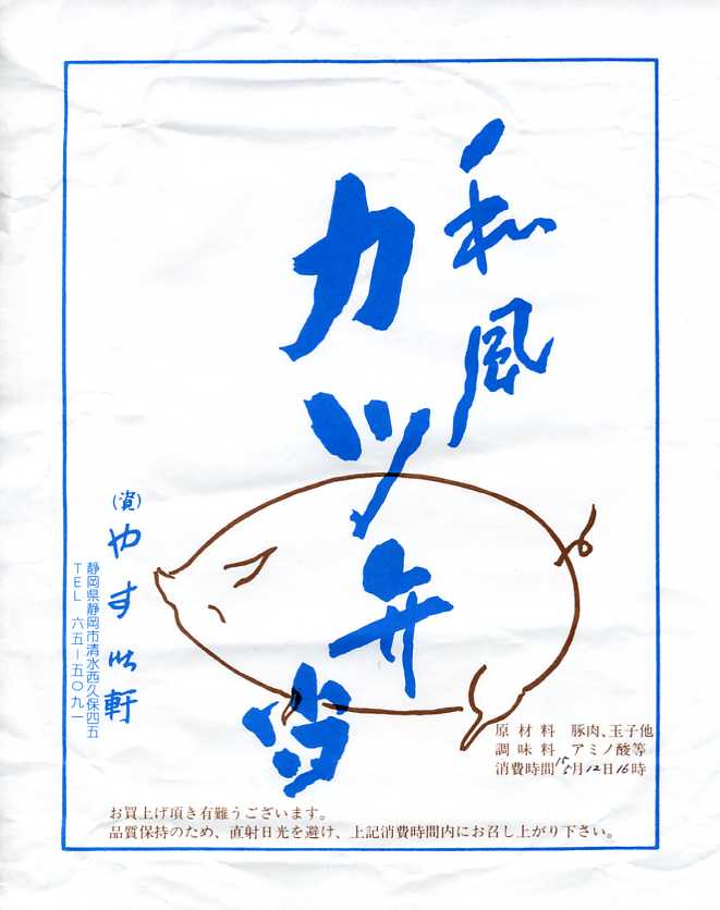 おそらく2003(平成15)年5月12日の調製と思われる、かつての清水駅の駅弁屋のお弁当の掛紙。どう見ても古めかしいが、消費期限の欄があるのに調製時間の欄がないので、21世紀の掛紙であることが分かる。