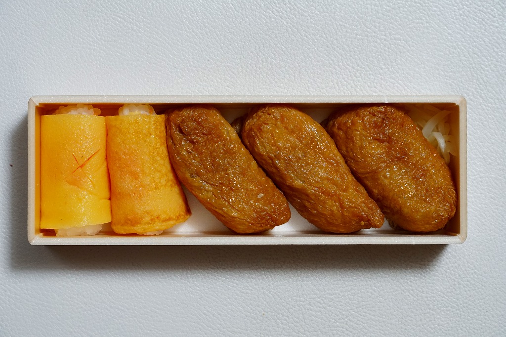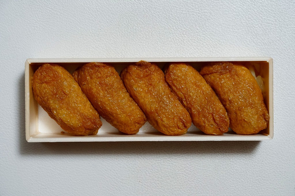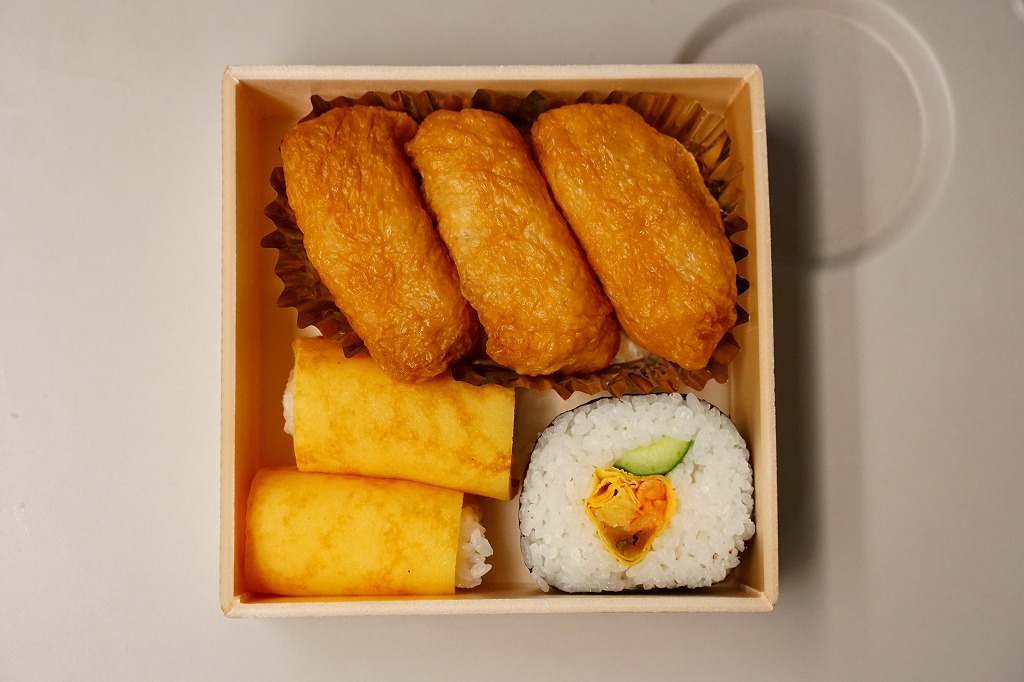 2000年代に清水駅弁と紹介され始めた、駅売り弁当類群のひとつ。細長い容器の中に、いなりずし5個を詰めたお惣菜。これに全種類共通ながら、鉄道らしい風景を描いた掛紙をかける。味は普通に柔らかい、中の上。刻みレンコンが酢飯の中に混入してあり、この食感がアクセントとなる。価格は2006年時点で420円、2015年時点で486円、2022年時点で562円。