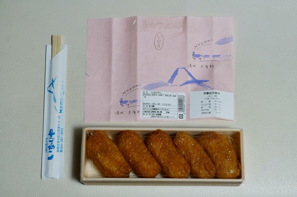 中身に駅弁らしい個性と地域性があり、目でも口でも感じる美しさ。容器や包装や販売形態の素っ気なさが惜しくなる、駅弁へ育てられるであろう駅売り軽食。調製元は静岡では有名な清水市街の高級寿司店で、近所に廉価な持ち帰り寿司店「いなりやNOZOMI」を営業し、これはそこの商品である。価格は2006年時点で525円、2015年時点で561円、2019年時点で648円、2022年時点で670円。