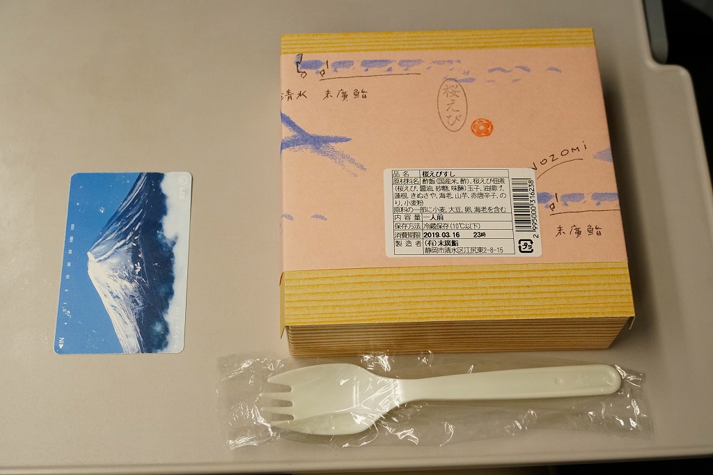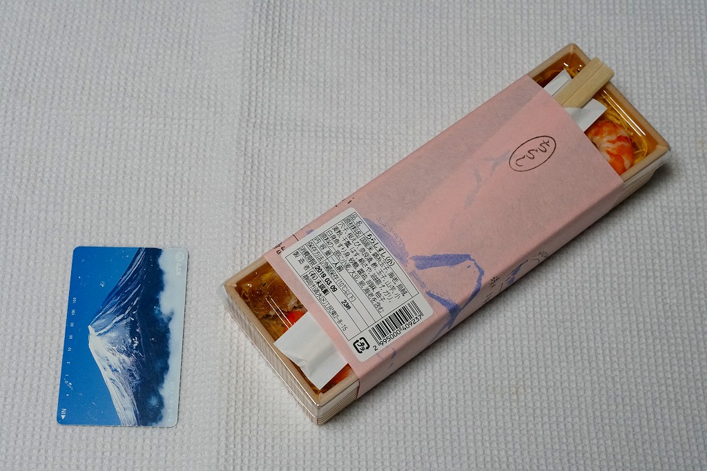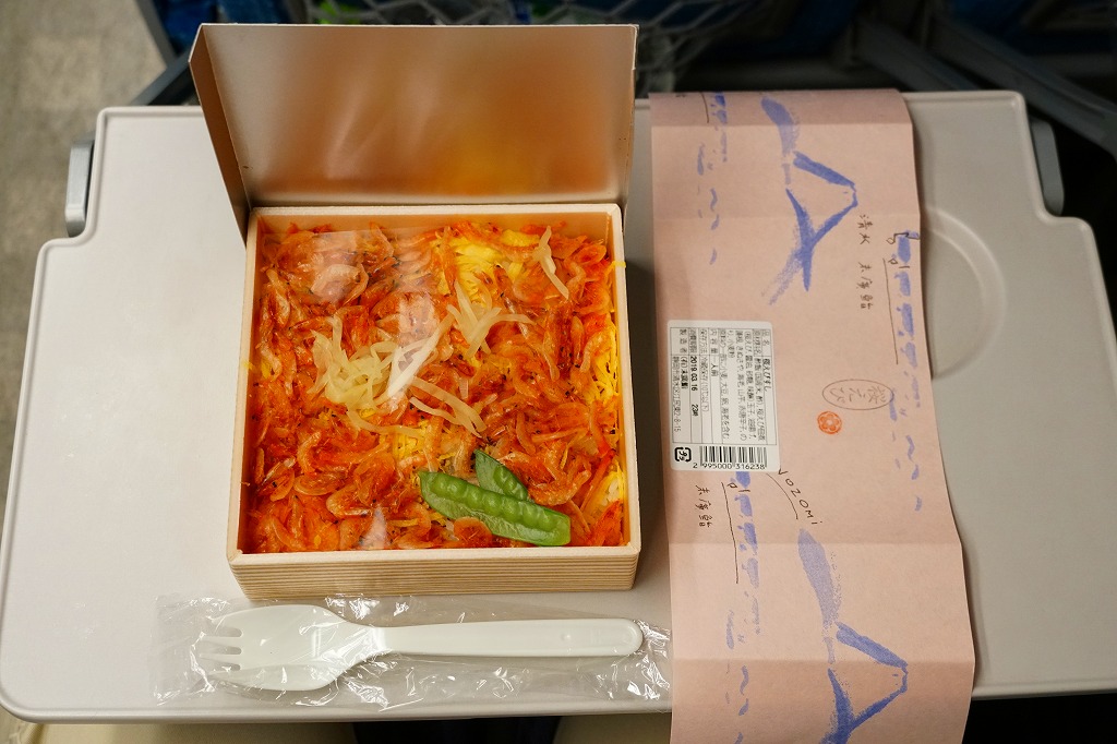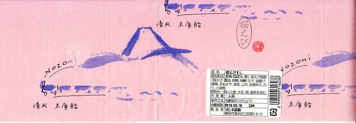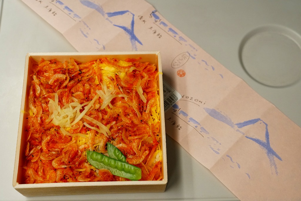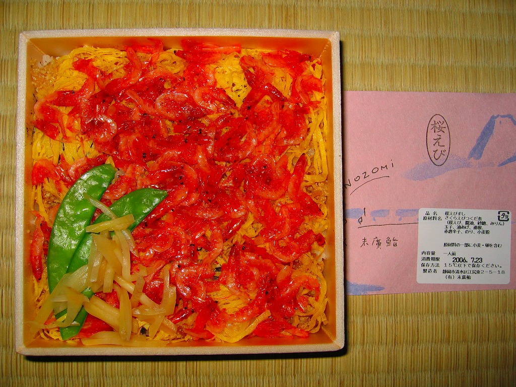 2000年代に清水駅の駅弁と紹介され始めた、清水駅のキヨスクで買えるお弁当。小さな正方形の容器に木目調の紙ぶたをかけて、調製元の地図と割りばしを載せて、富士と列車を描き「桜えび」とスタンプしたサクラエビ色の掛紙をかけて、セロテープで留める。中身は油あげやレンコンを混ぜた酢飯の上に、手作り感のある錦糸卵を敷き詰め、駿河湾名産のサクラエビを佃煮にしてたっぷり振り、さやいんげんとショウガを添えるもの。