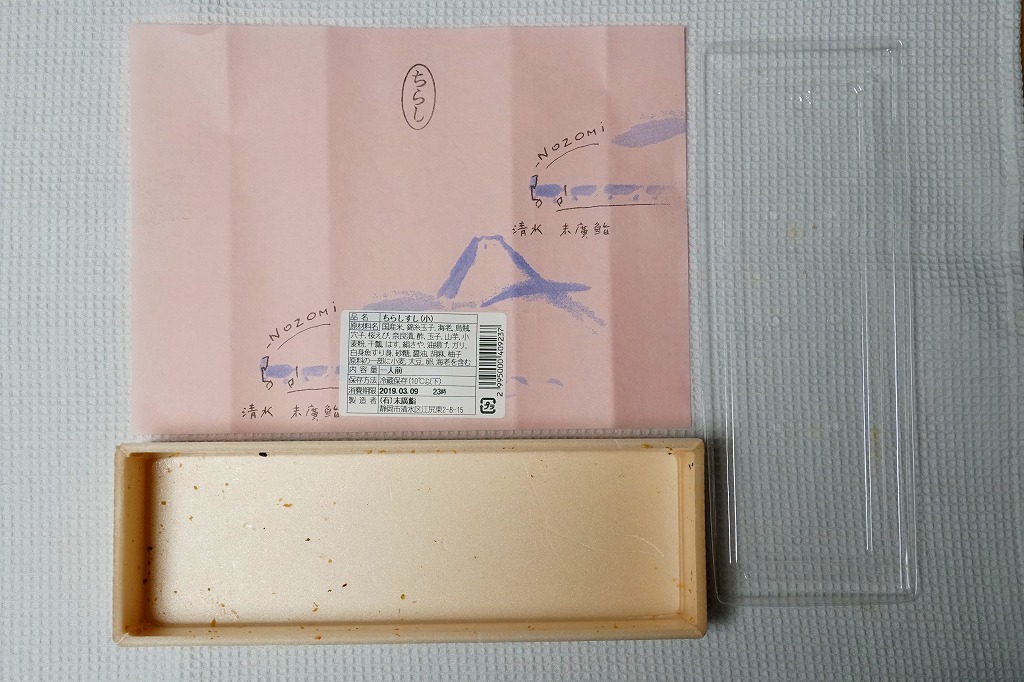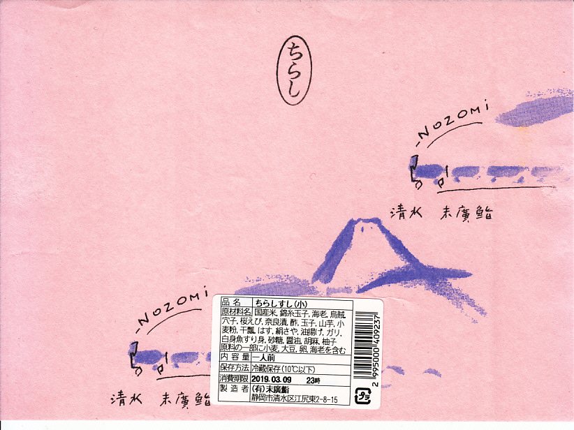 清水駅のキヨスクで買えるお弁当。公式な駅弁ではないが、駅で買えて、以前から売られて、駅では清水駅のみで買える地元の商品であるため、清水駅の駅弁と認識されることがある。この調製元の商品群で共通して使われる、サクラエビ色で富士山や汽車が描かれる掛紙に、「ちらし」の判子を押し、品名を「ちらしずし(小)」とする食品表示ラベルを貼る。