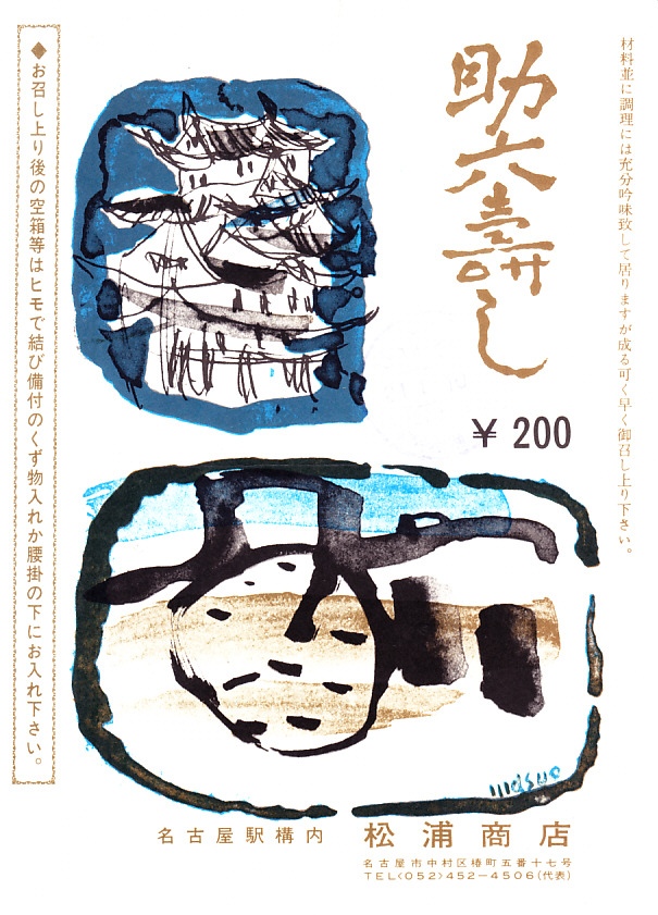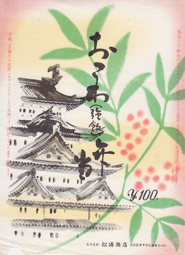 1960年代のものと思われる、昔の名古屋駅弁の掛紙。名古屋城天守を描く絵柄は下記のものと同じだが、色彩が明らかに異なる。
