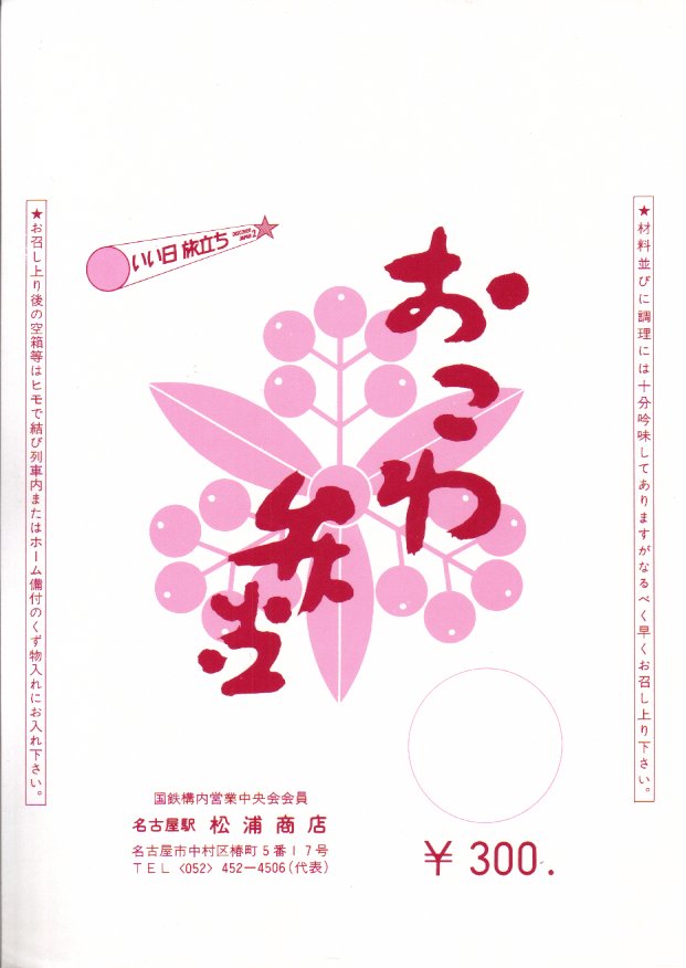 昭和50年代のものと思われる、昔の名古屋駅弁の掛紙。価格帯の低い駅弁用だったのか、単色刷のシンプルで、しかし当時の国鉄の旅行キャンペーン「いい日旅立ち」のマークはしっかり入っている。