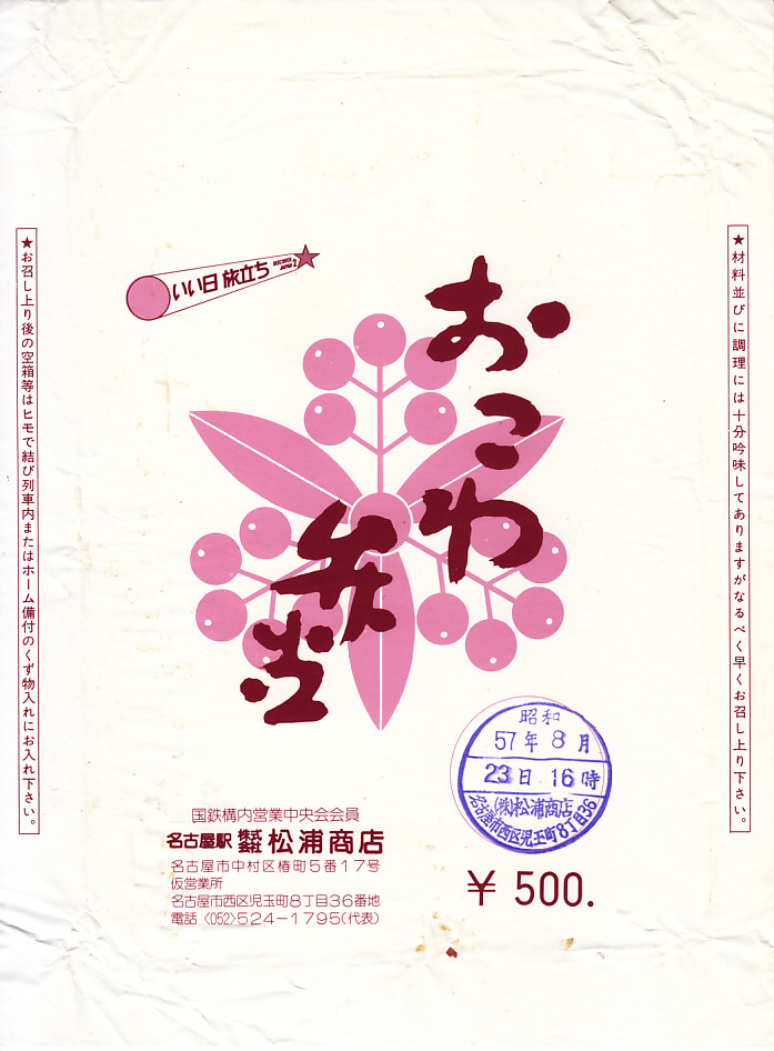 1982(昭和57)年8月23日16時の調製と思われる、昔の名古屋駅弁の掛紙。下記のとおり、絵柄は10年くらい変わらないが、価格が上がったり、国鉄のキャンペーンのアイコンが変わったり、ここでは調製元が仮営業所に移転するなどの変化はある。