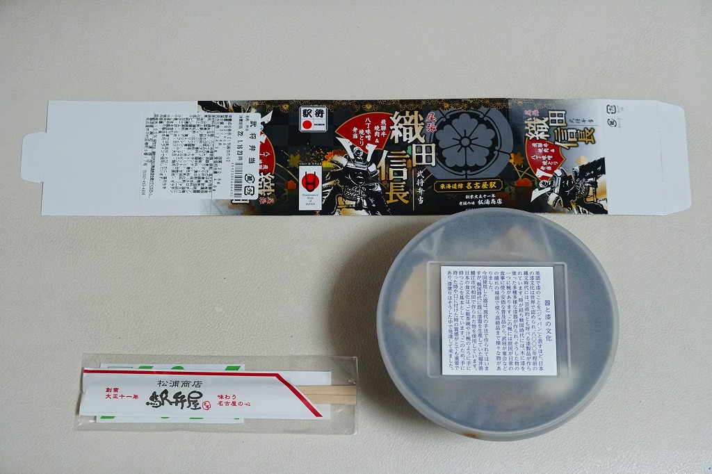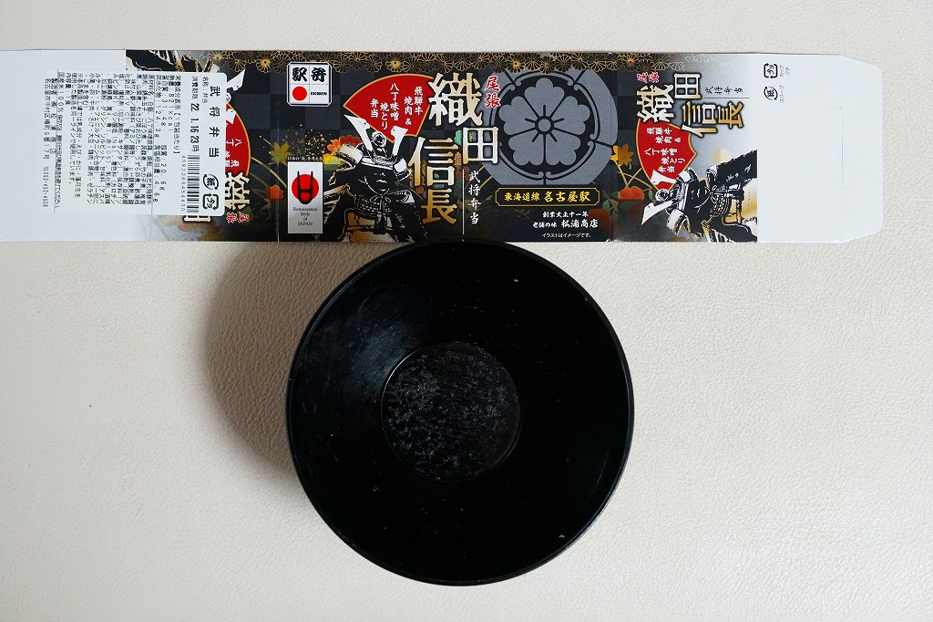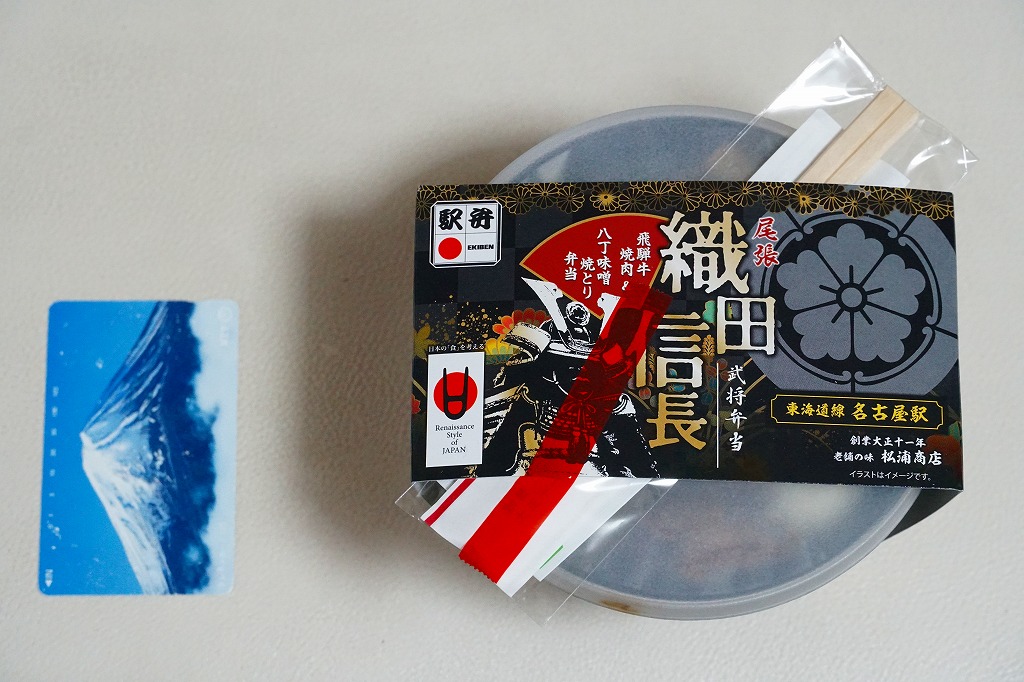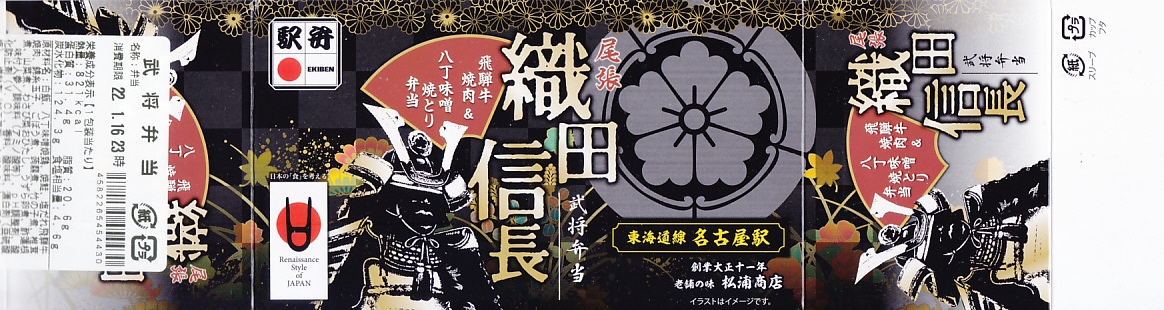 織田信長は戦国時代の武将。現在の愛知県名古屋市に生まれ、天文20年(1551年)頃に父の信秀から家督を継ぐと、一族を統一し、尾張を平定し、西進して室町幕府を滅ぼし、天下統一へ向かい現在の関西とその周囲を収めたところで家臣の明智光秀に謀反で討たれた。誰もが知る日本史上のスーパーヒーローで、今もテレビに雑誌にゲームにと取り上げられ続ける人気なのに、駅弁の織田や信長は定着することなく、まったく不振に見える。この駅弁(ではないかもしれないが)はどうか。