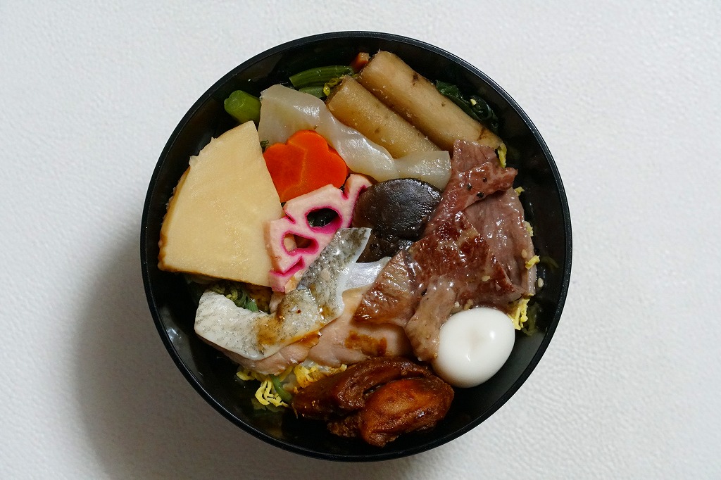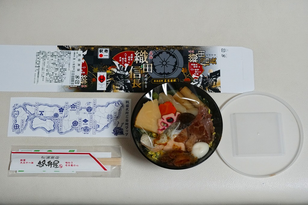 今回は黒いプラ容器が円錐状とボウル状で2種類あり、この織田信長は円錐状のもの。これに織田家の家紋を入れ、日本古窯弁当と同じ半透明のふたをして、今回のシリーズで共通のしおりを置き、それらしき絵柄のスリーブで留める。中身は白飯を八丁味噌焼鶏、焼鮭、塩だれ飛騨牛焼肉、ごぼうやタケノコなどの煮物で覆うもの。牛に鶏に鮭と欲張りな構成で、具の種類が多く賑やかに思える。