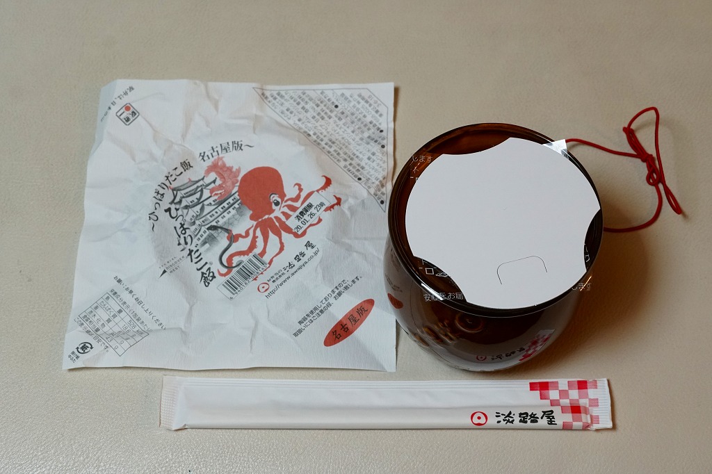 2020(令和2)年1月に阪神百貨店の駅弁大会で販売。西明石駅と日本を代表する人気駅弁「ひっぱりだこ飯」について、その発売20周年で2018(平成30)年8月に福岡版、翌9月に広島版が登場し、その第3弾に見えたがどうだろう。名古屋駅で売られたという話は聞いていない。見た目や内容や風味は、西明石駅弁とほとんど同じ。名古屋版ということで、掛紙に名古屋城を描き、中身にウナギ蒲焼の小片を加えた。名古屋駅で売られたかどうかは分からない。